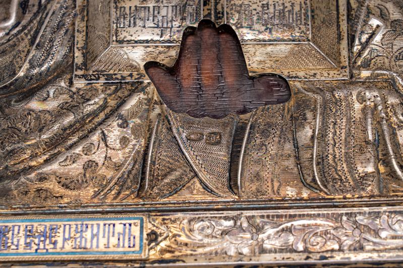 Icona a tempera su tavola raffigurante Cristo Pantocratore con riza in argento e smalti policromi. Mosca, 1908–1926