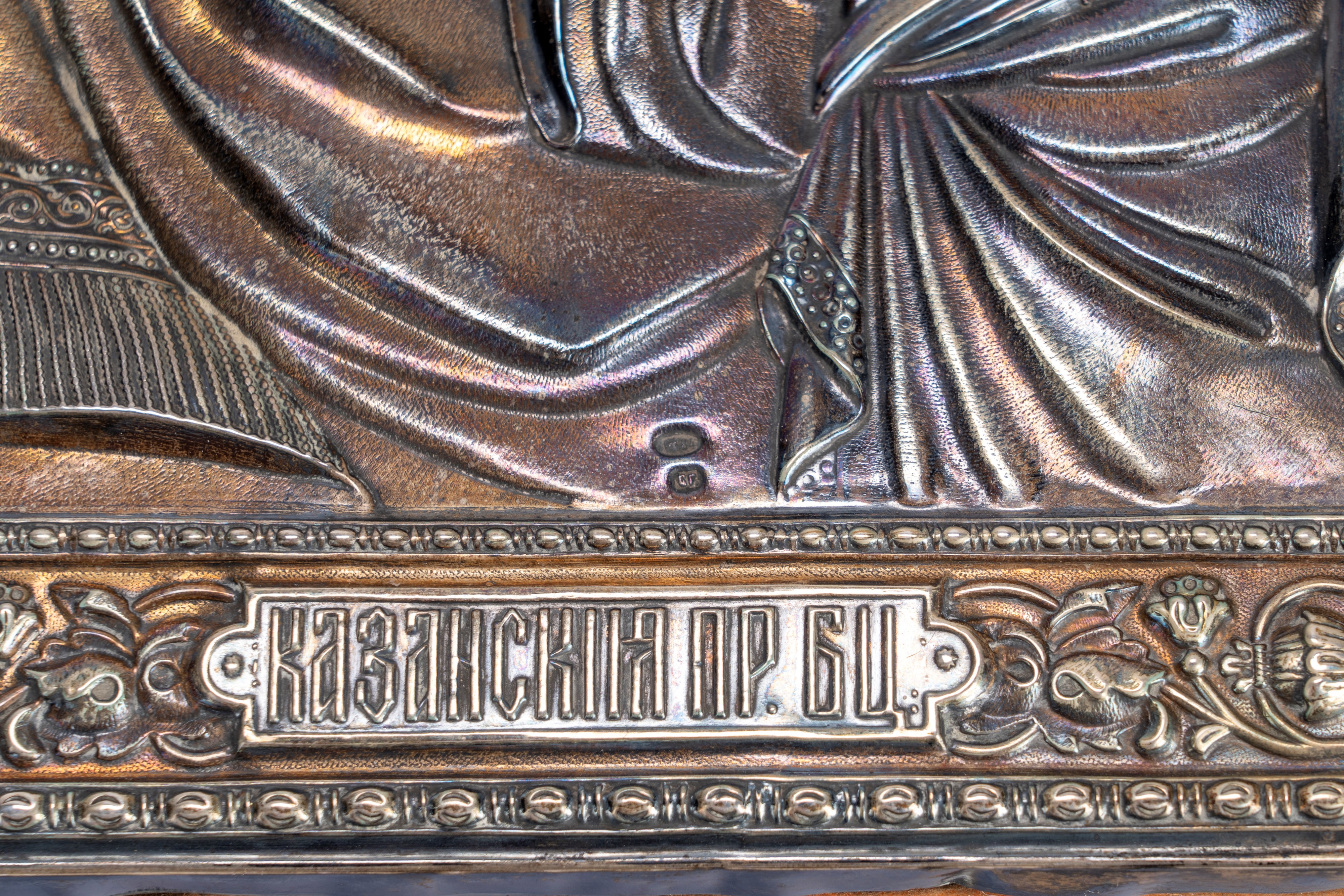 Icona su tavola con riza in argento raffigurante la Vergine di Kazan. Russia, 1908–1926