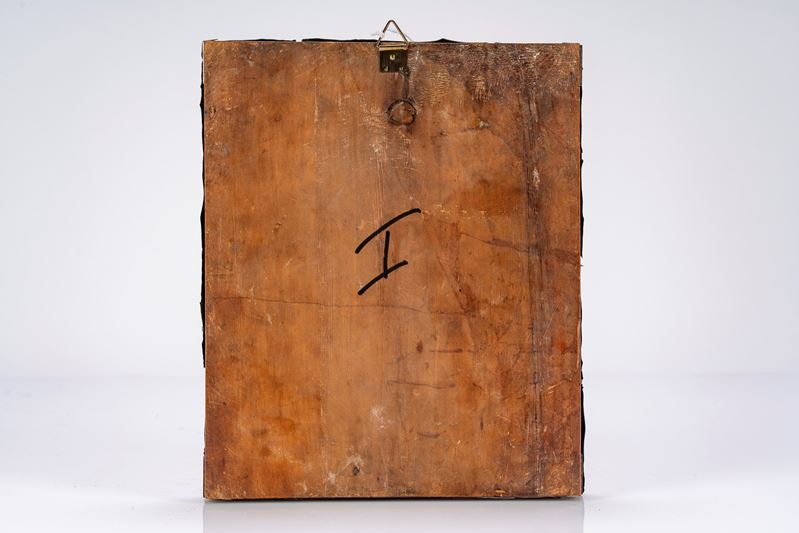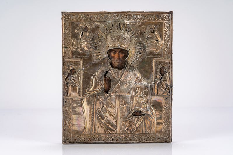 Riza sbalzata e cesellata con bordura a motivi vegetali, aureola coronata a raggiera aggettante. Punzone dell’assaggiatore Vasily Aleksandrovich Petrov, 1845, titolo 84 zolotniki, punzone della città datato 1844.