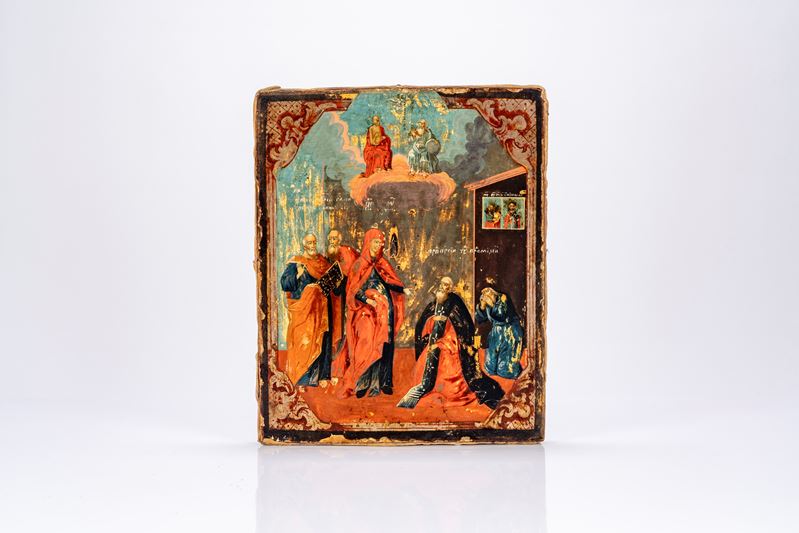 Icona su tavola raffigurante l’apparizione della Vergine a san Sergio di Radonež, fondatore del Monastero della Trinità. Russia, inizi XIX secolo