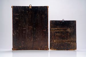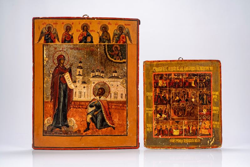 Lotto di due icone su tavola raffiguranti l’Apparizione della Vergine a sant’Alessio e le Dodici Grandi Feste. Russia, XIX secolo