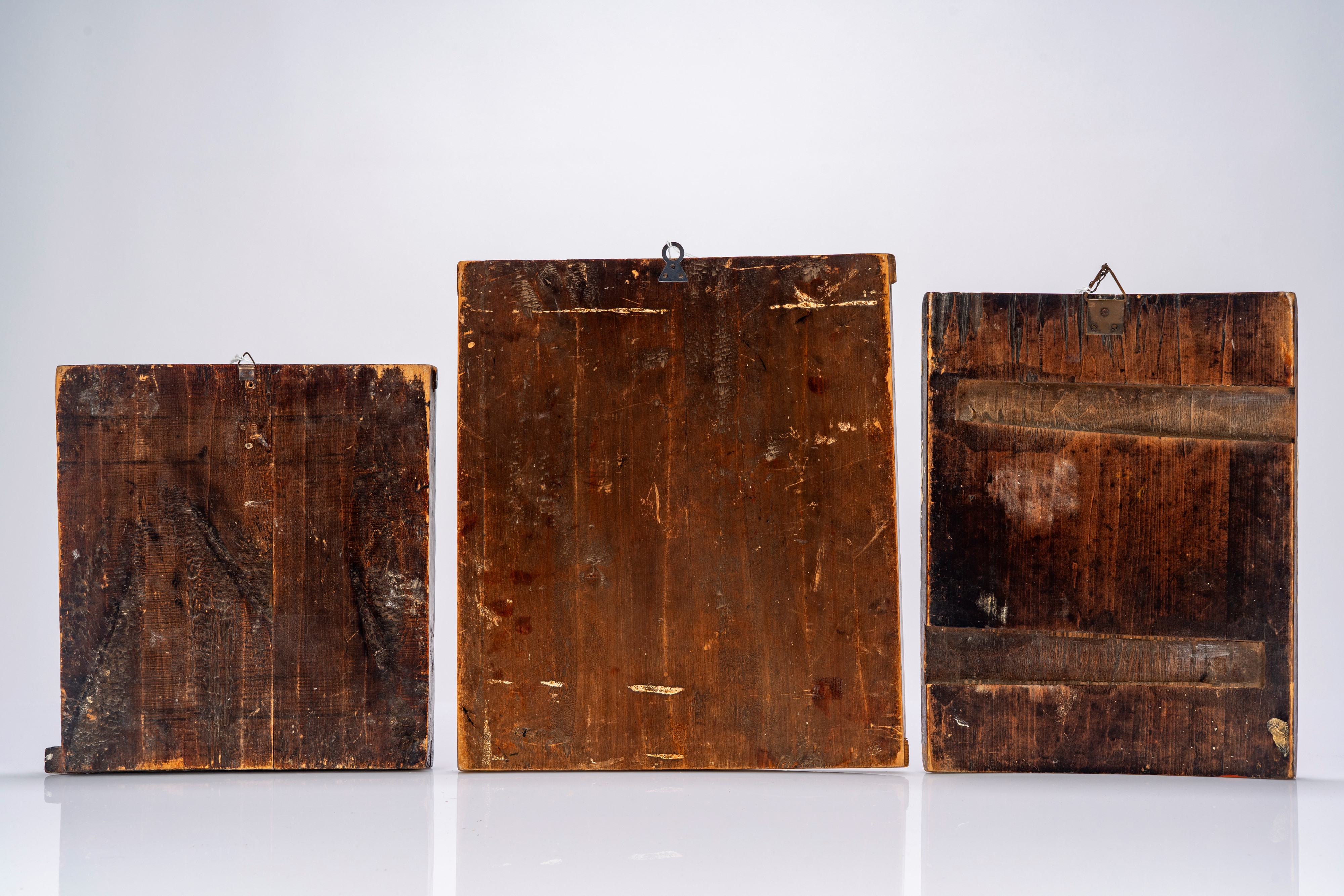 Lotto di tre icone su tavola raffiguranti Cristo benedicente, la Madonna della Deesis e una quadripartita con la Vergine con Bambino. Russia, XIX secolo