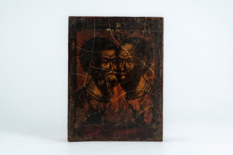 Quattro icone su tavola raffiguranti Cristo Pantocratore, la Madre di Dio Orante, la Madre di Dio della Radice di Kursk e i santi apostoli Pietro e Paolo. Russia, fine XIX – XX secolo