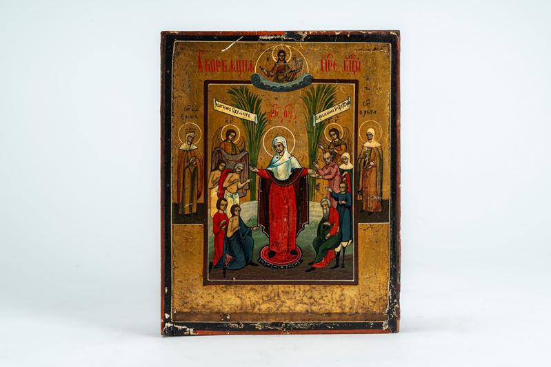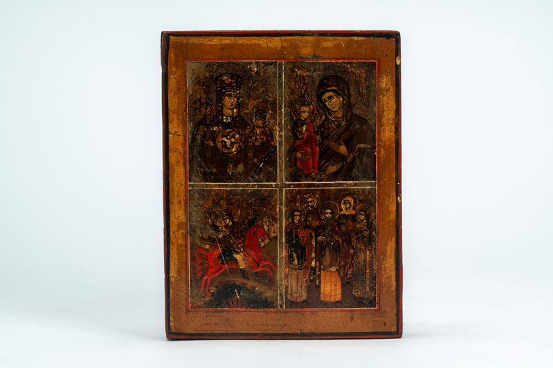 Quattro icone su tavola: una stauroteca, una Madonna di Kazan, una mariana quadripartita e una...