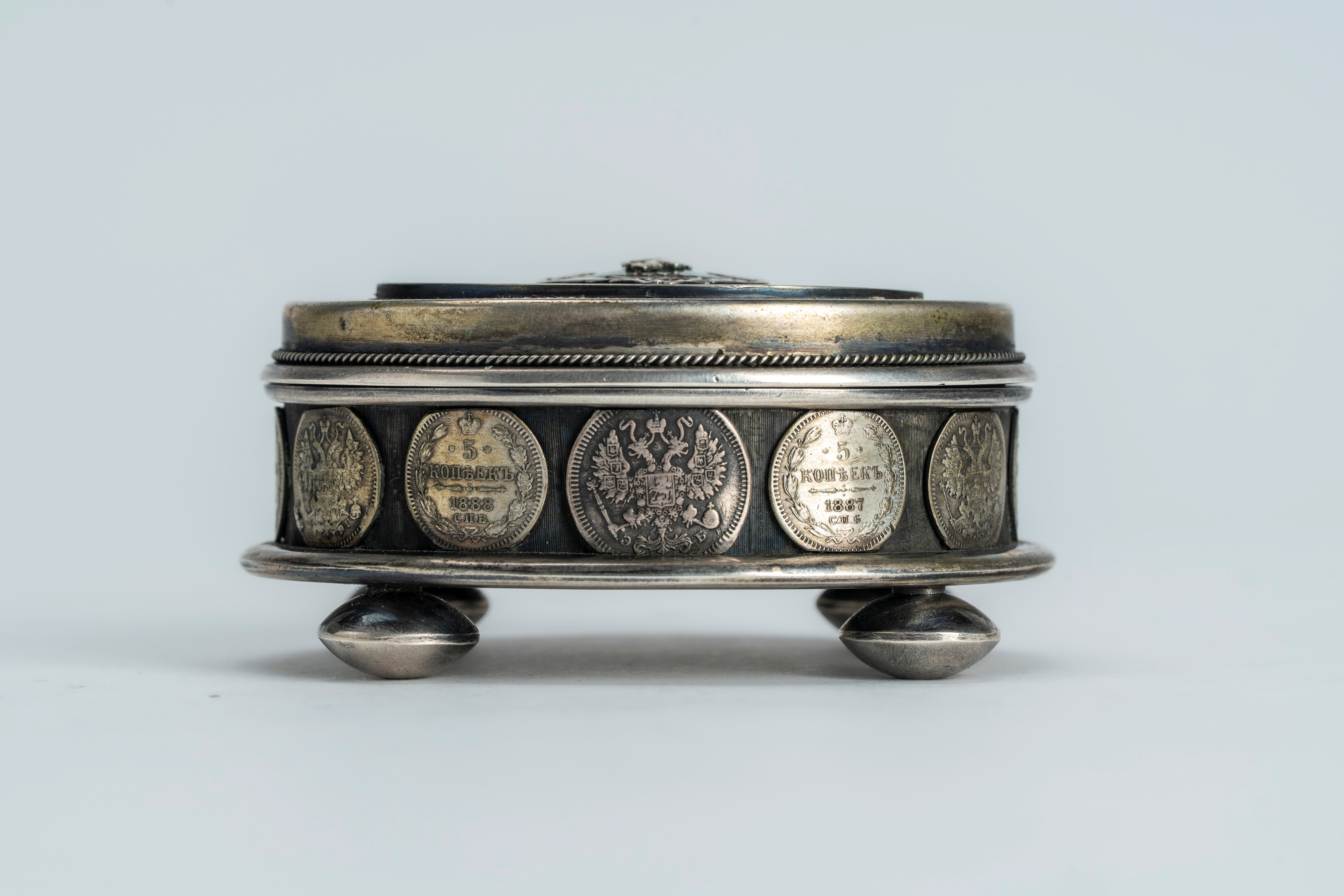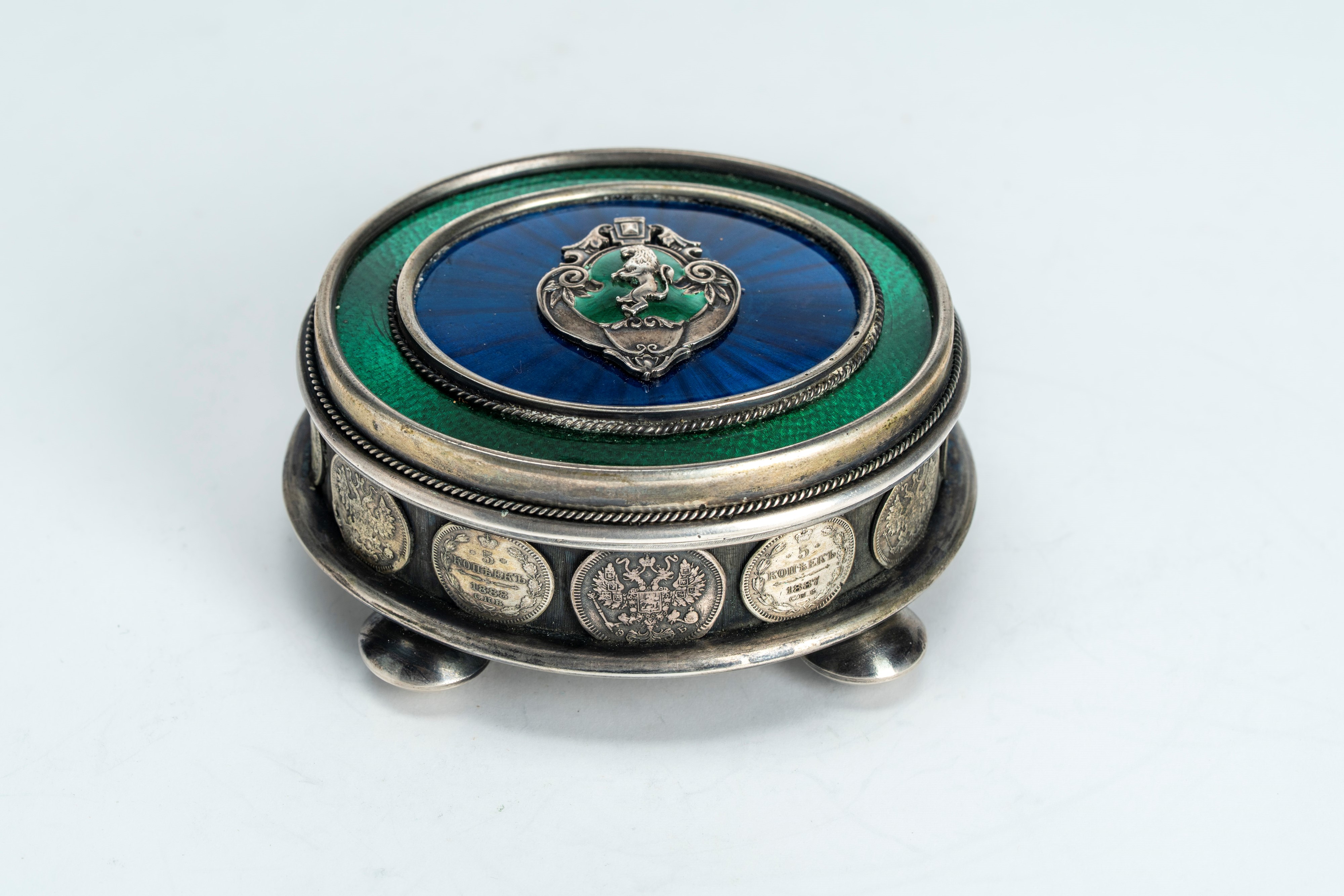 Scatola con coperchio in argento e smalti guilloché verde e blu con fascia di monetine incassate. San Pietroburgo, circa 1873–1898