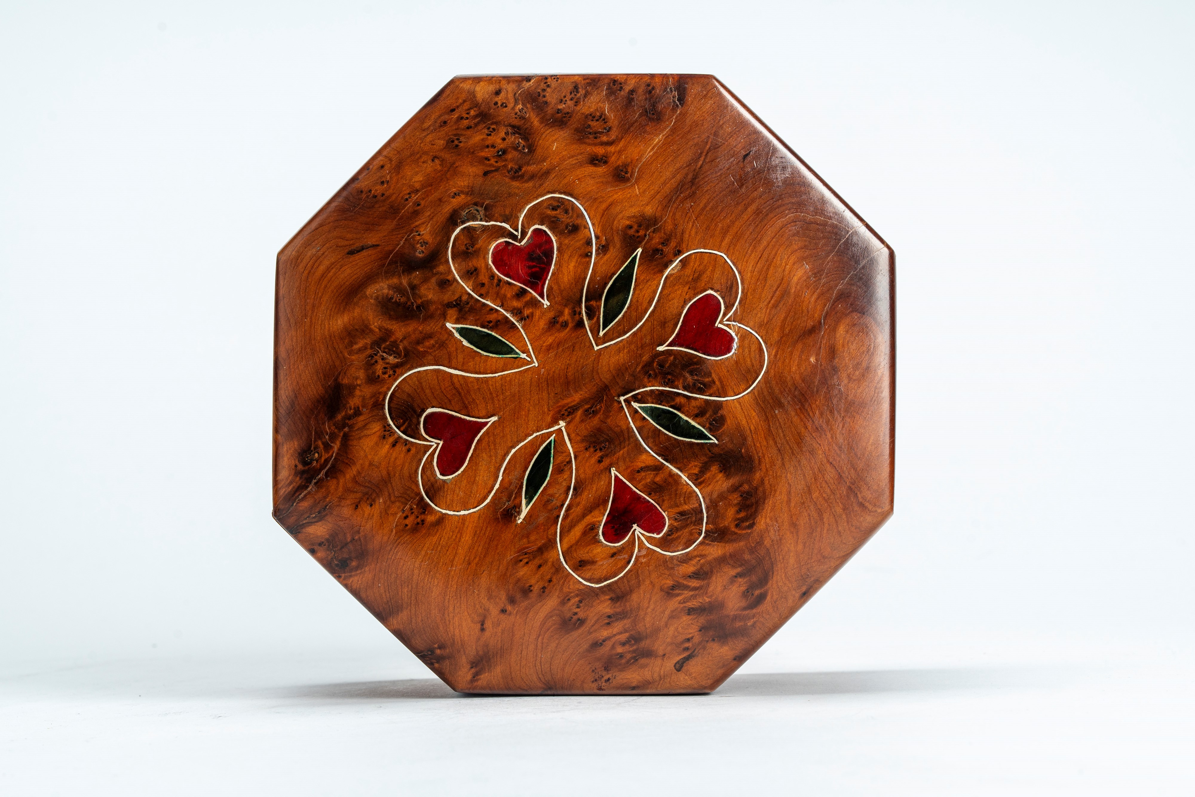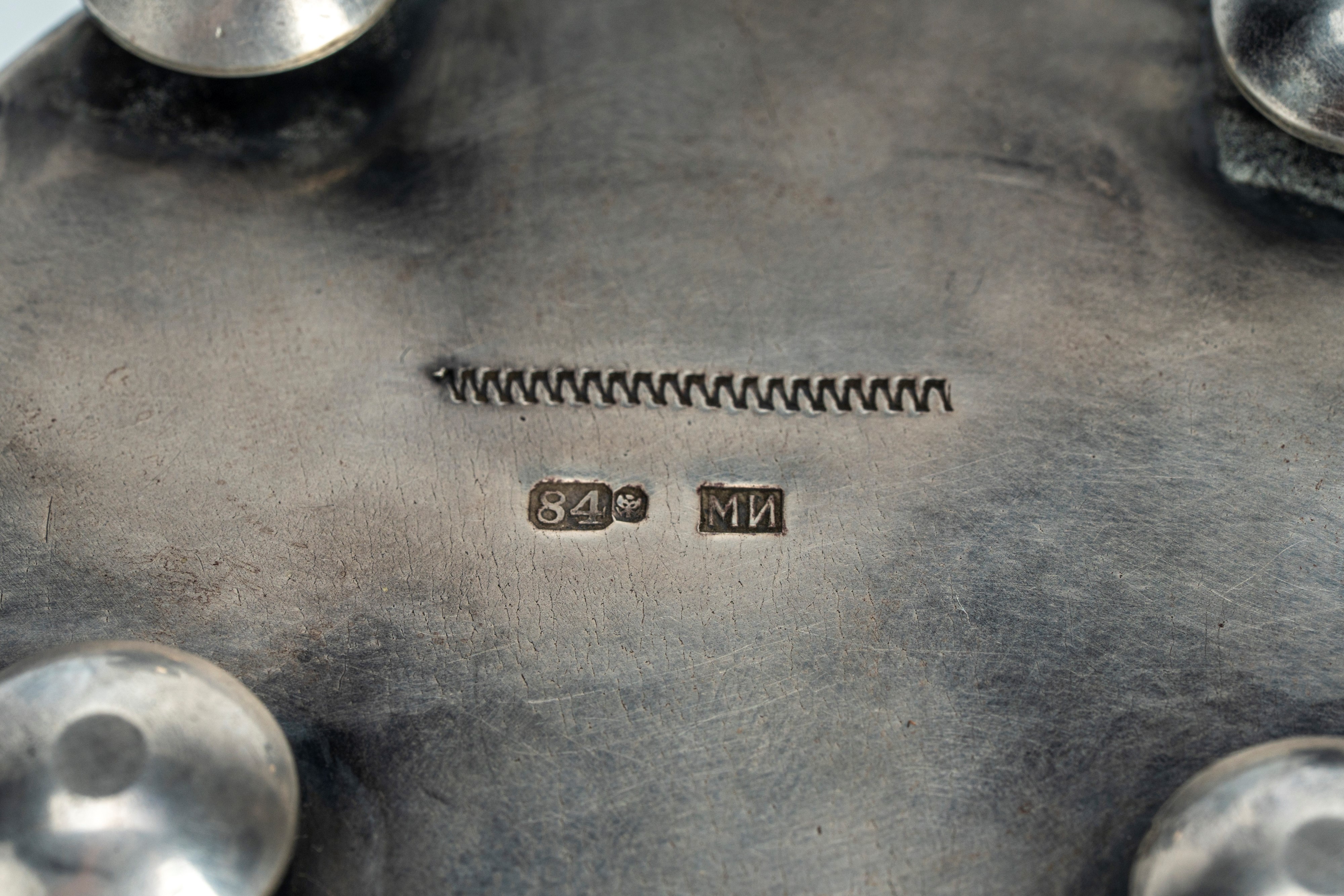 Poggiante su quattro piedini semisferici. Il coperchio è centrato da un fregio smaltato con leone rampante. Entro custodia ottagonale in legno. Reca punzone dell’argentiere Mikhail Iakovlevich Isakov, 84 zolotniki.
