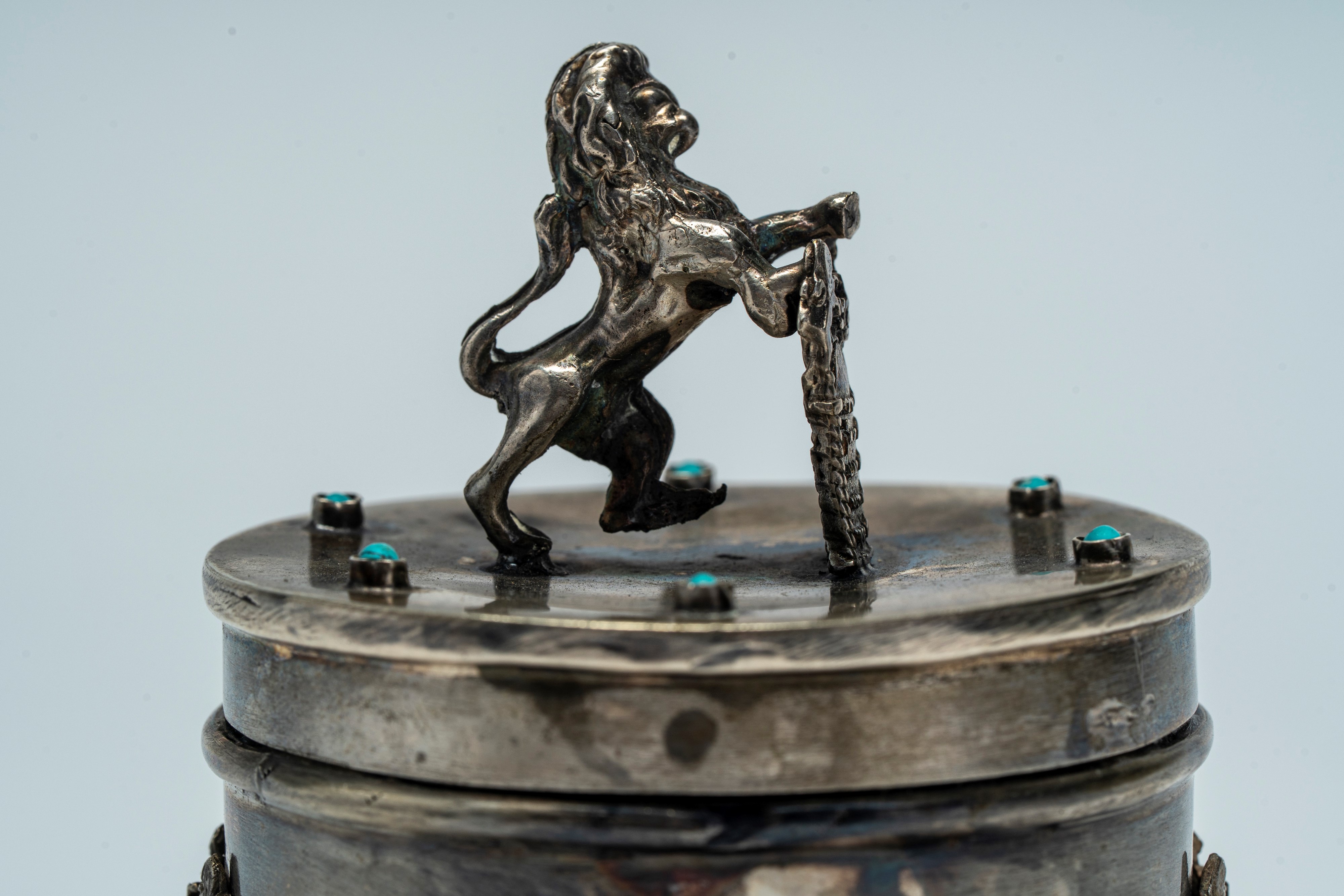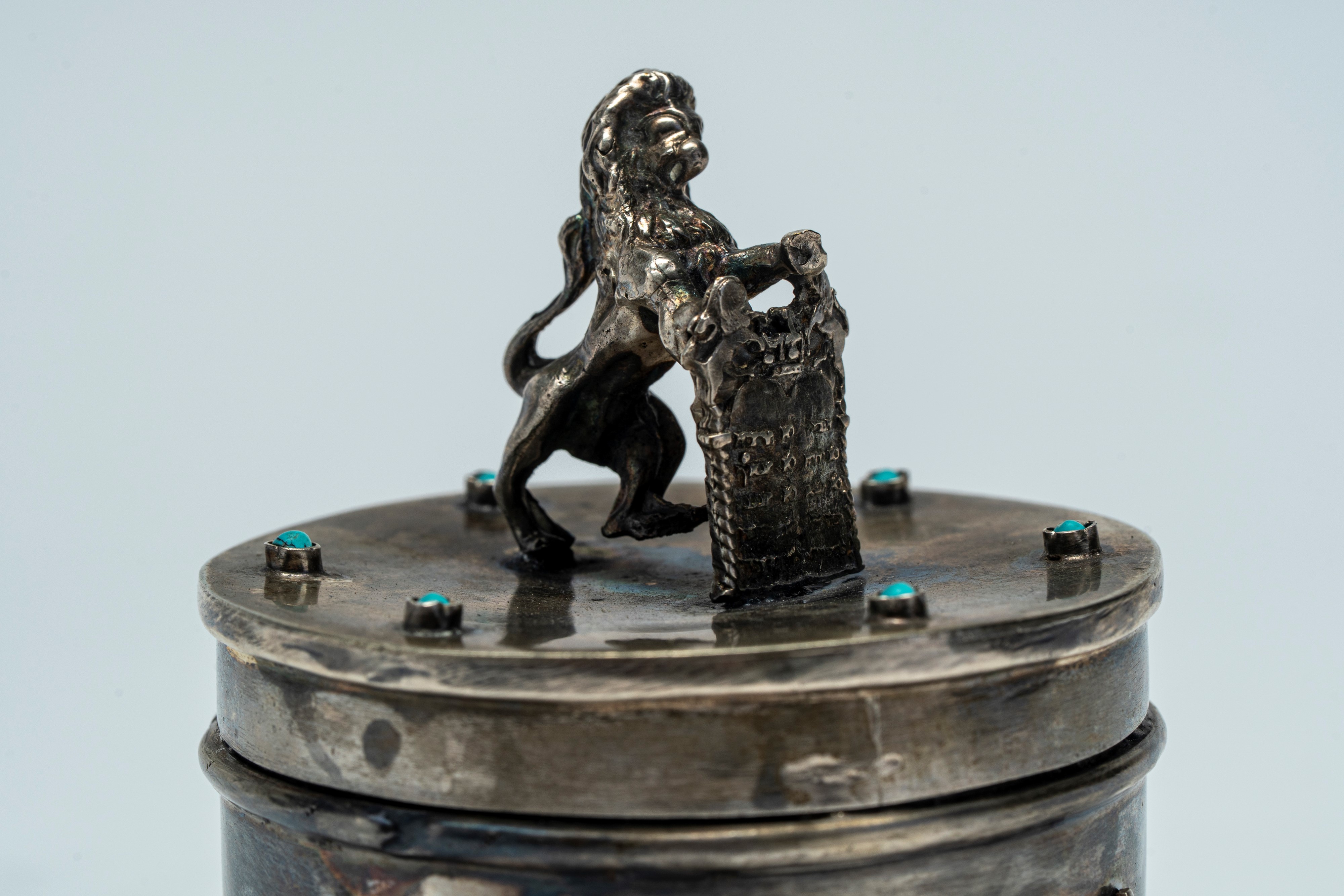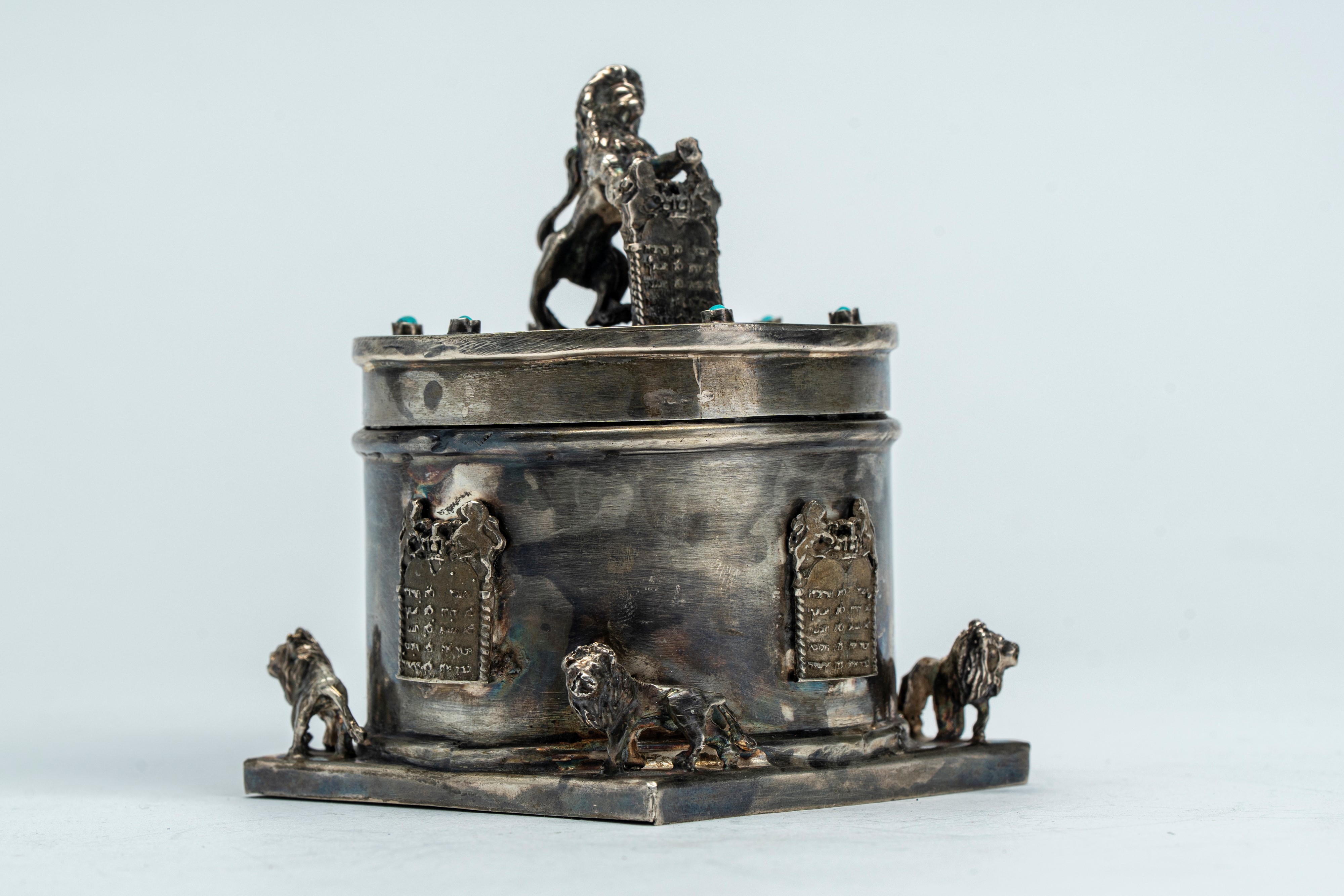 Scatola con coperchio in argento e smalti turchese, sormontata dal Leone di Giuda con le Tavole della Legge. Russia, fine XIX secolo