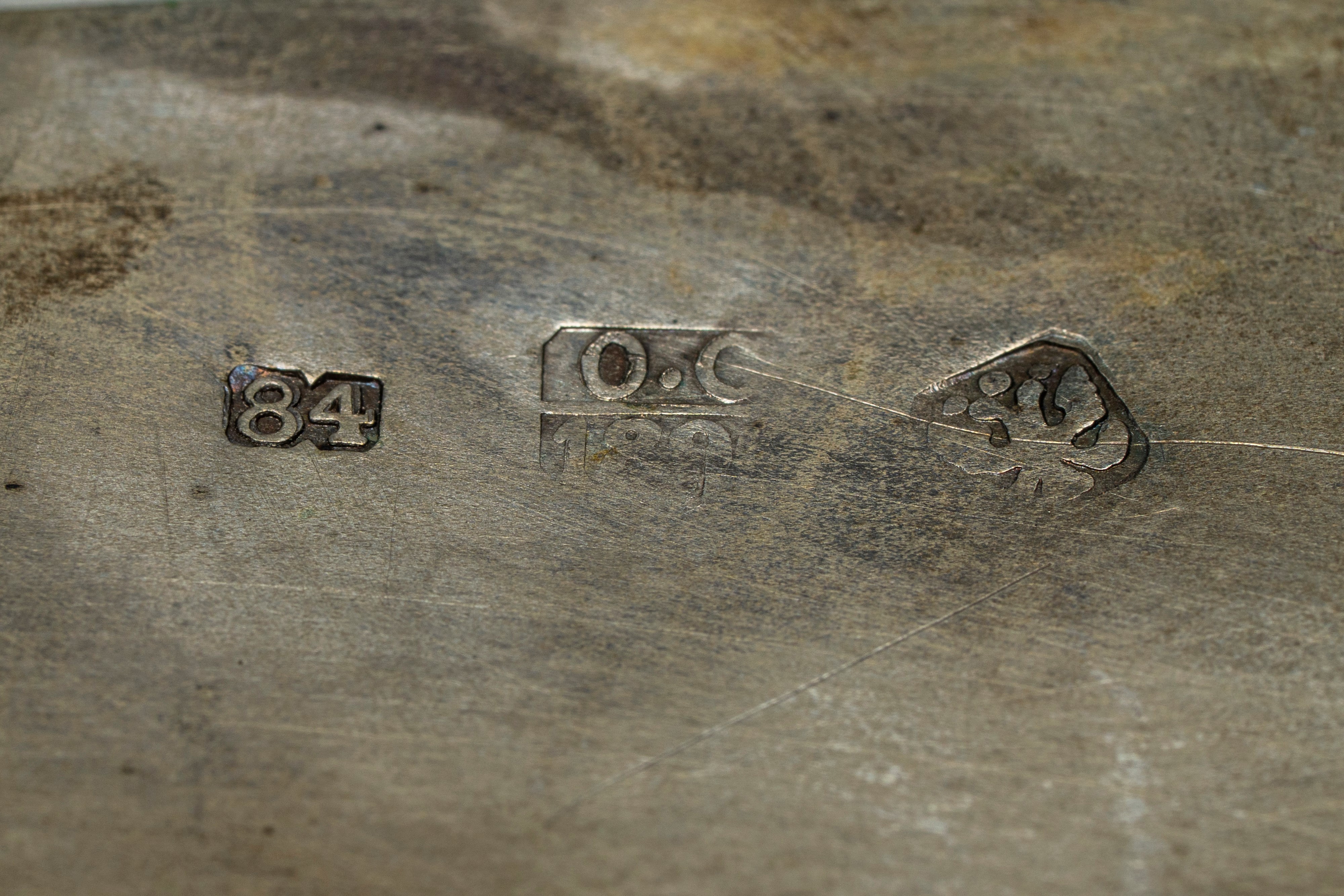 Sulla base quattro leoni angolari a tutto tondo; il corpo della scatola è decorato da quattro fregi applicati a forma di Tavole della Legge. Reca punzoni dell’assaggiatore «O.C.», probabilmente Josef Sosnkowski, 189..., 84 zolotniki.
