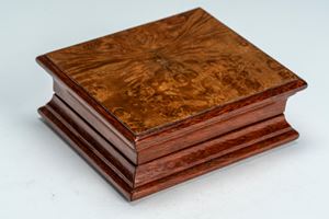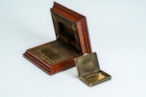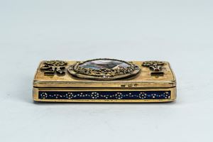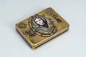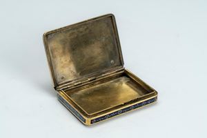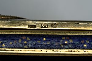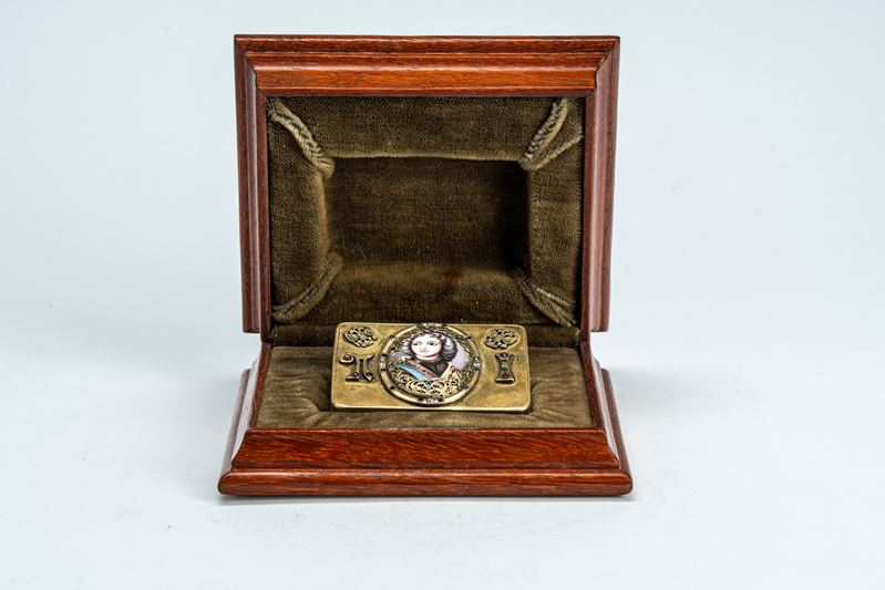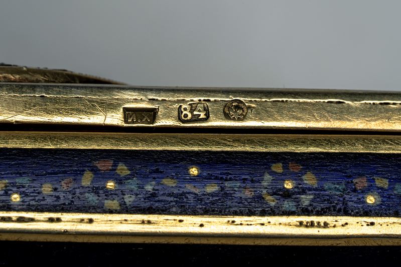 Sul coperchio medaglione smaltato entro cornice traforata con ritratto, probabilmente di Pietro I Romanov “il Grande” (1672–1725), tra il monogramma “П I” e aquile bicipiti imperiali a rilievo. Fasce e base in smalto blu. Entro astuccio ligneo. Reca punzoni dell’argentiere Ivan Petrovich Khlebnikov e della città di San Pietroburgo, titolo 84.