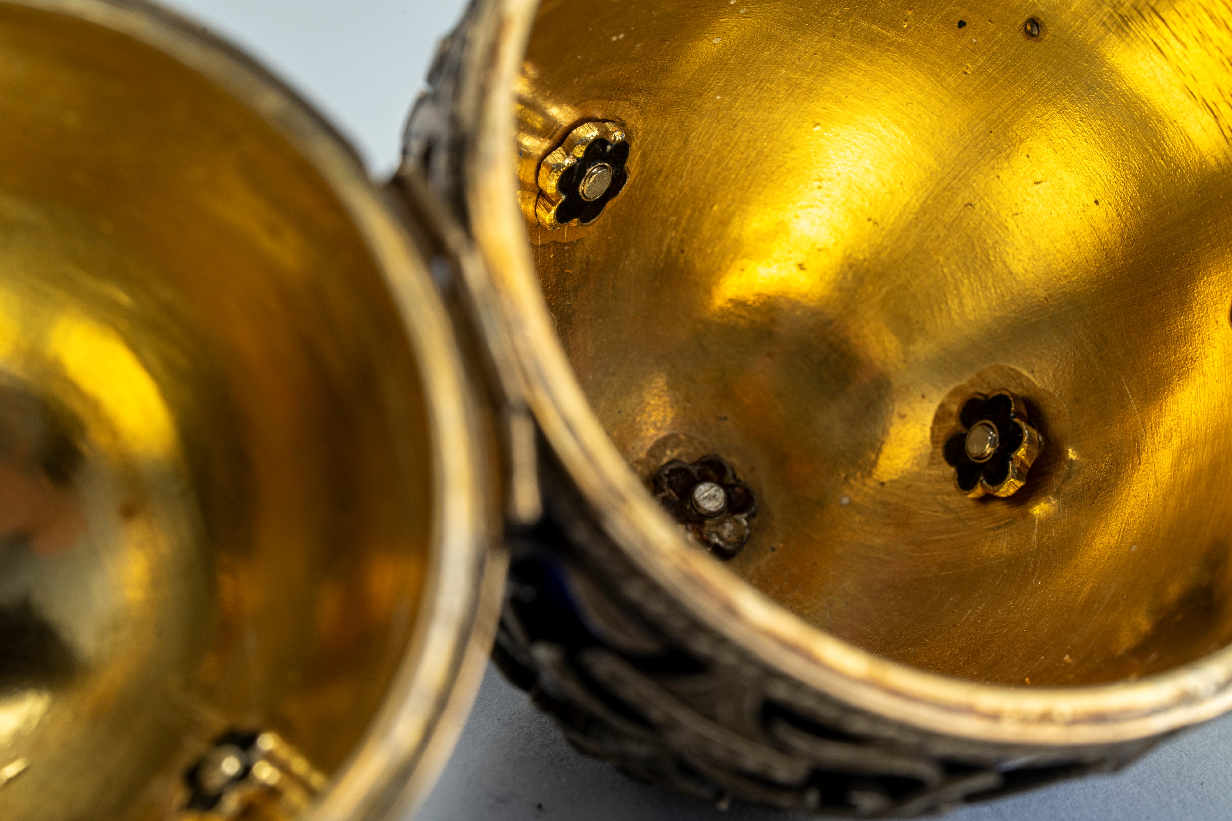 Decorato con tre fregi ad aquile bicipiti imperiali e due cabochon. Poggiante su sostegno tripode. Reca un punzone parzialmente abraso e il punzone «I.P.» dell’argentiere Julius Rappoport, titolo 84 zolotniki.