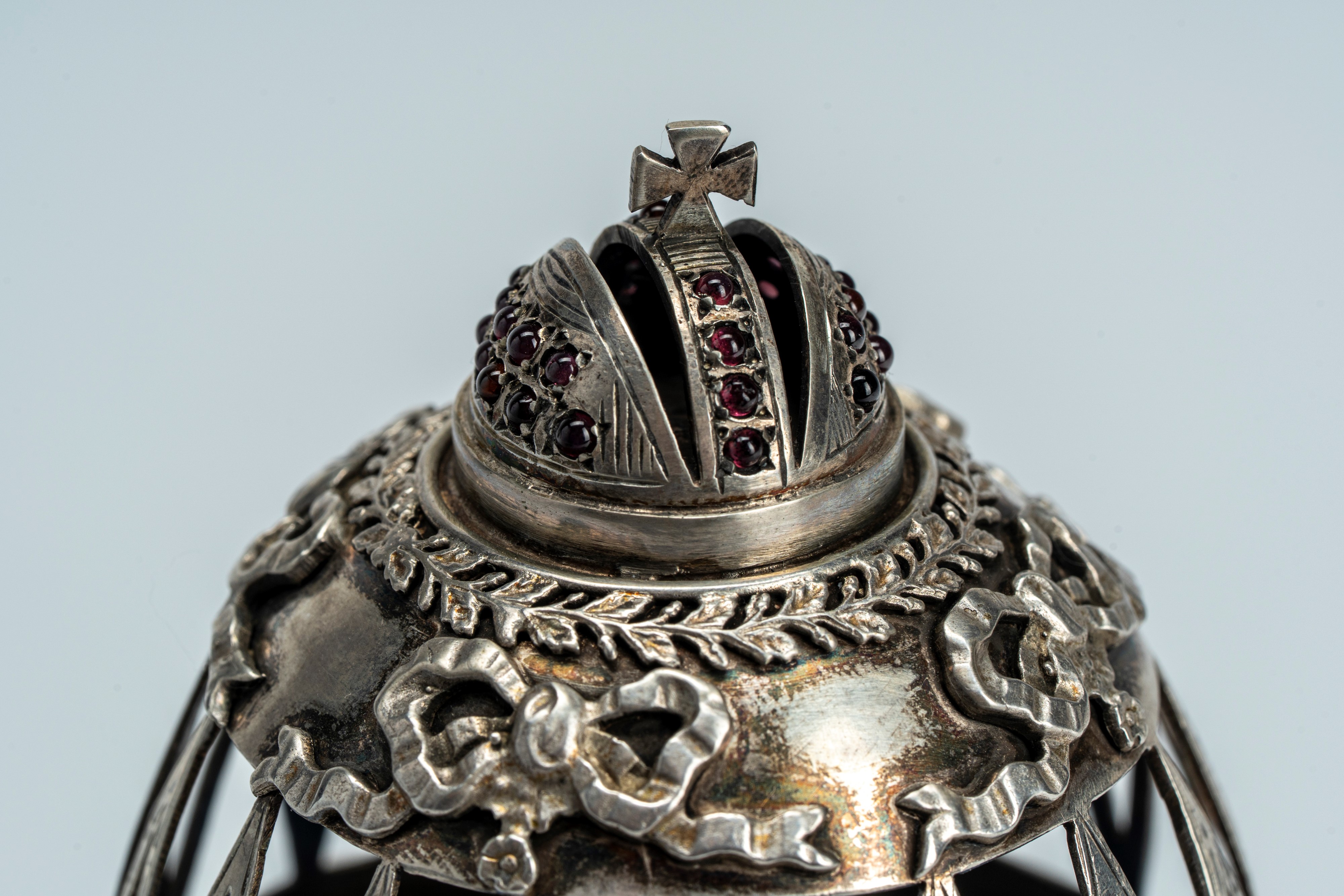 La parte inferiore presenta medaglioni uniti da fiocchi raffiguranti san Giorgio e il drago e l’aquila bicipite imperiale. Il coperchio incernierato, traforato e sormontato da corona cela una sorpresa in miniatura con san Giorgio e il drago su fondo in smalto azzurro guilloché.