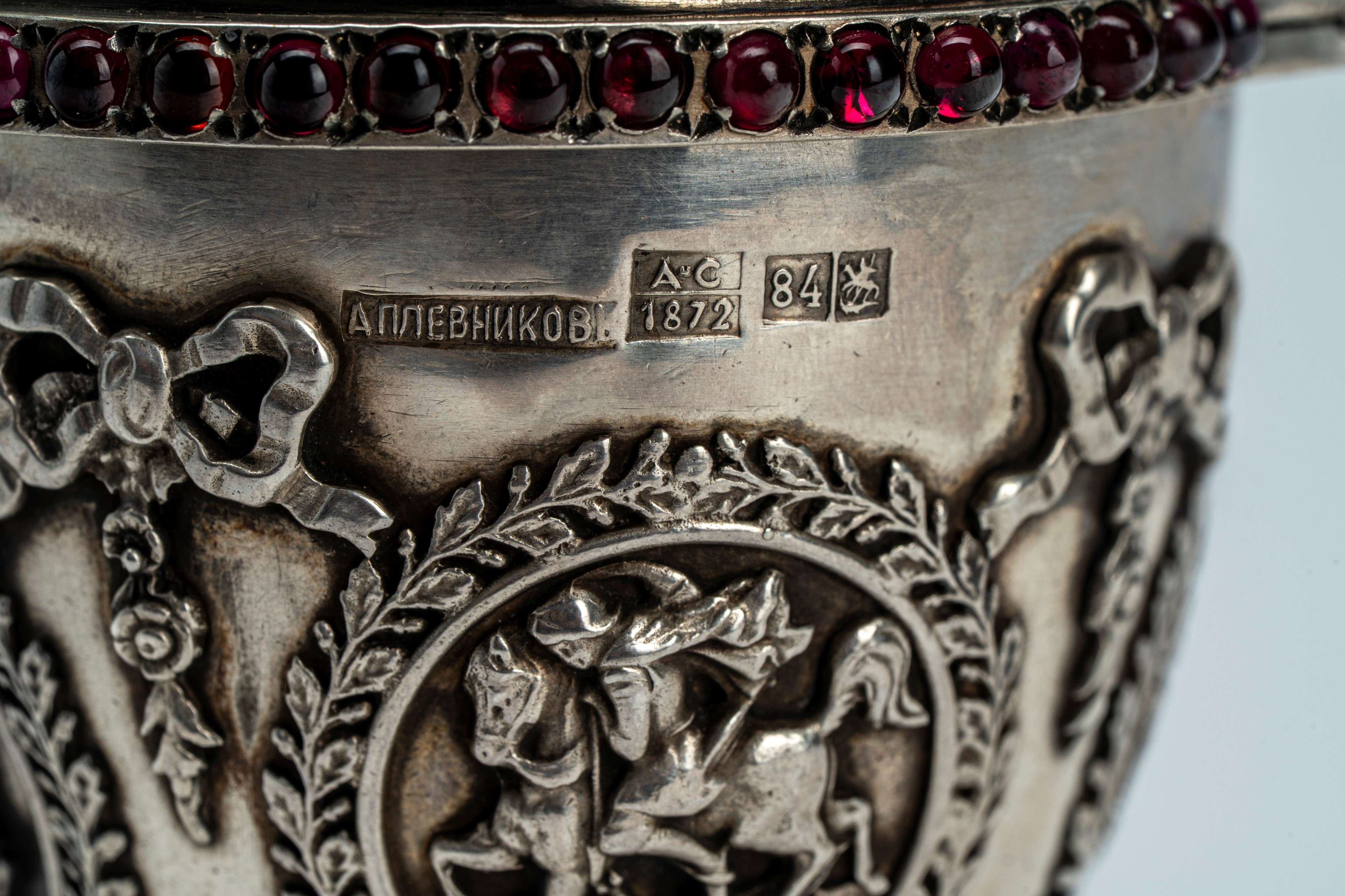 Reca punzoni dell'argentiere, dell'assaggiatore "A.C." probabilmente Aggey Grigoryvich Svechin, 1872, 84 zolotniki, Mosca.