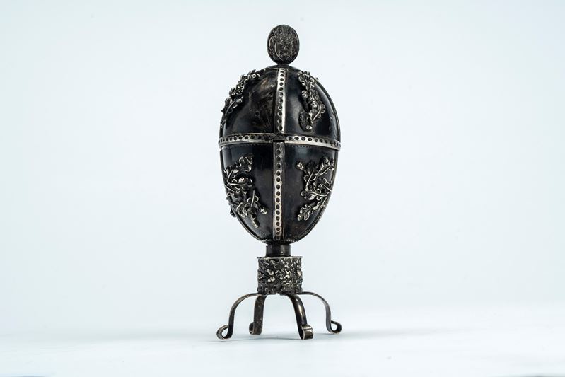 Uovo in argento con coperchio e sostegno a quattro piedini a ricciolo removibili. San Pietroburgo, secolo XIX