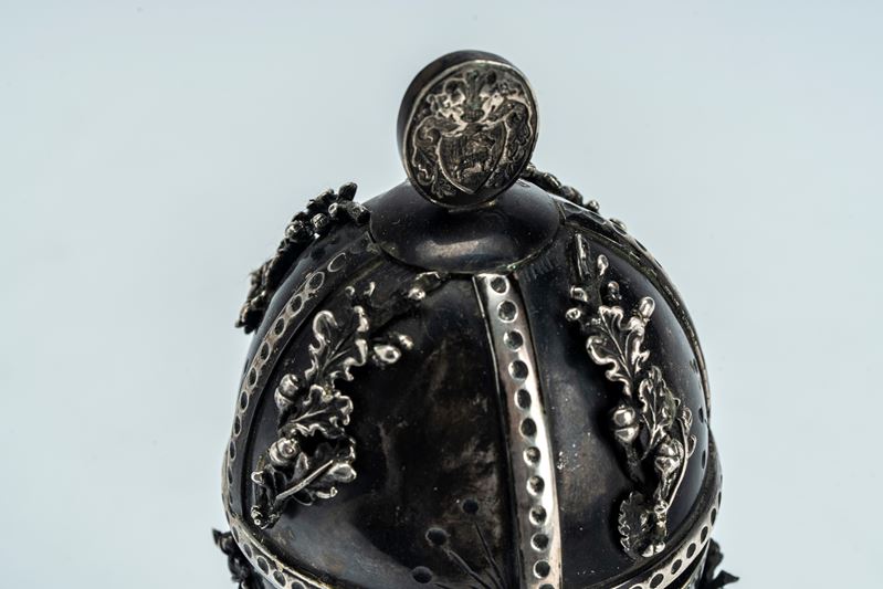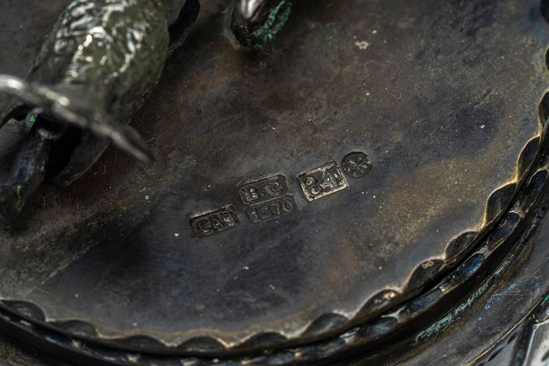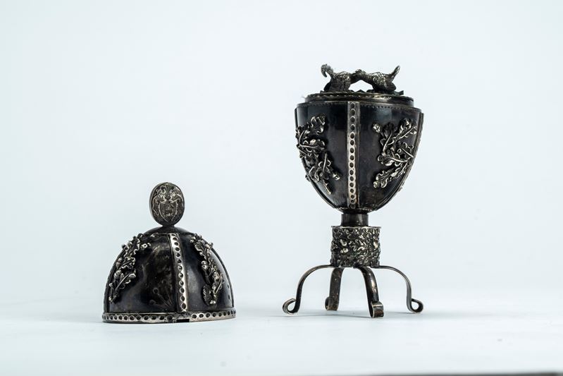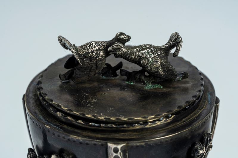 Decorato a foglie di quercia e bordure a rilievo, con presa del coperchio a medaglione inciso con scudo araldico. All’interno cela due galli in miniatura realisticamente incisi. Alla base, nel punto di innesto con il sostegno, cabochon color ametista.