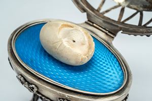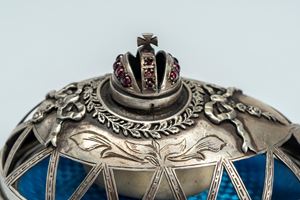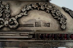 Poggiante su sostegno removibile a quattro piedini uniti da ghirlande. Coperchio apribile traforato sormontato da corona, celante sorpresa a forma di pulcino poggiante su base in smalto azzurro guilloché. Reca punzone dell’argentiere, dell’assaggiatore A.C. (probabilmente Aggey Grigoryvich Svechin), 1872.
