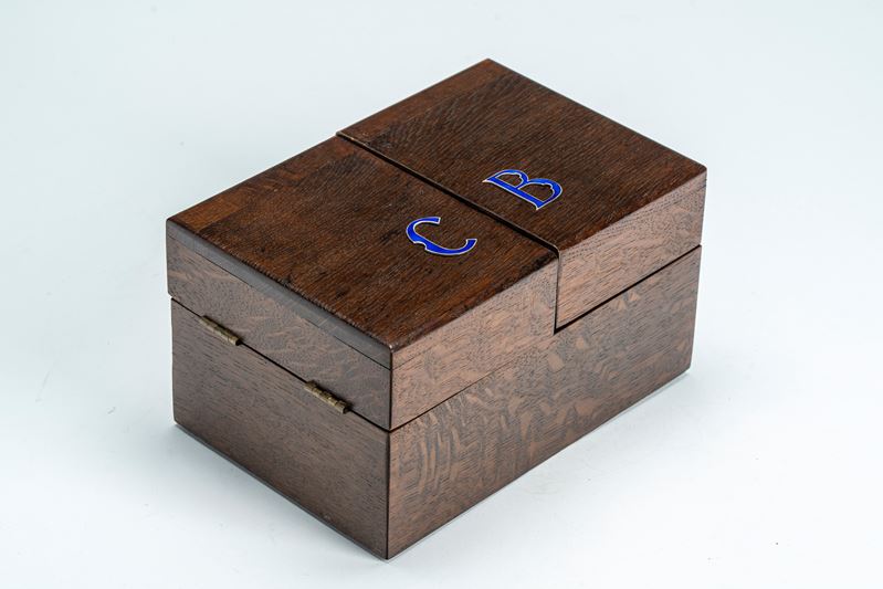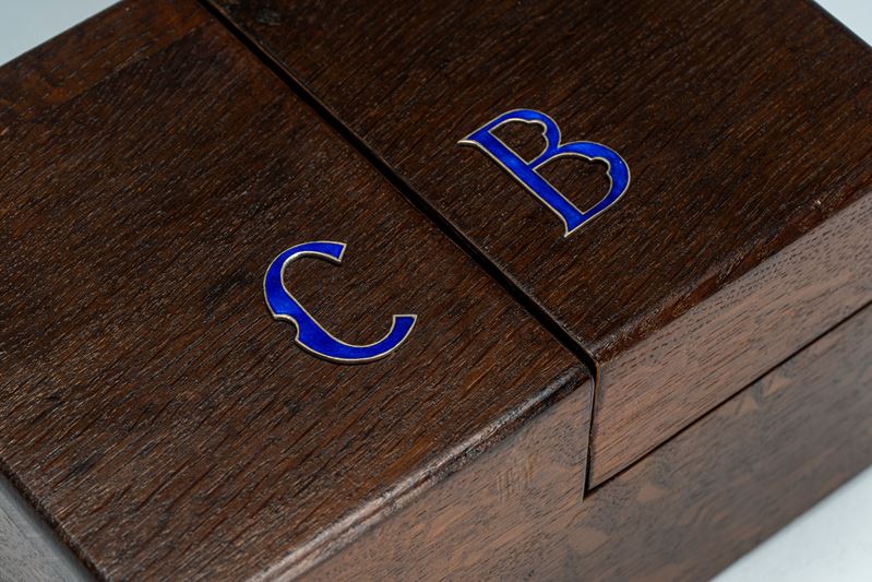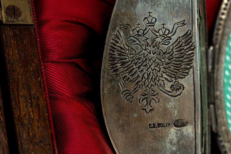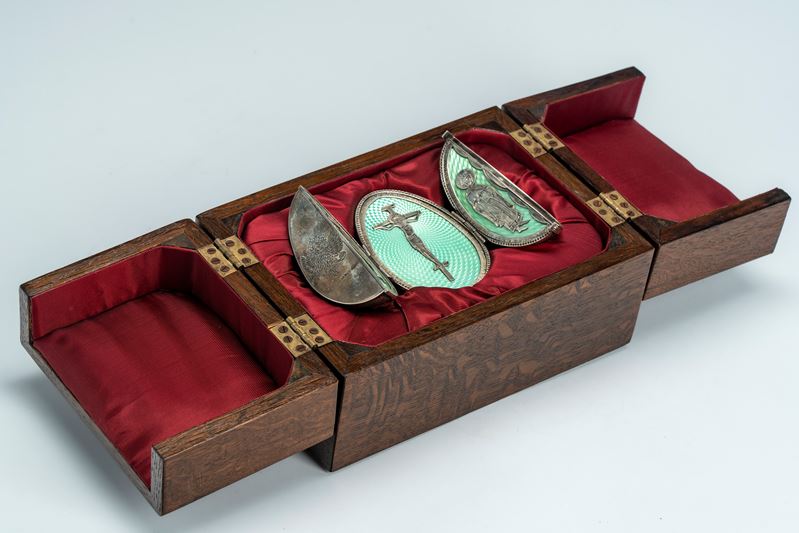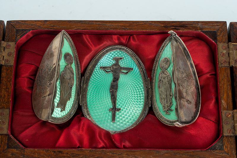 All’interno Cristo crocifisso tra la Madre di Dio e san Giovanni Evangelista, in lamina d’argento incisa su sfondo verde smaltato. Entro astuccio in legno foderato in raso rosso, con iniziali “C B” smaltate in blu. Coperchio in forma di due semigusci apribili e incernierati. Reca punzone dell’argentiere C.E. Bolin, kokoshnik 84, assaggiatore Ivan Sergeyevich Lebedkin (Mosca, 1898–1914).