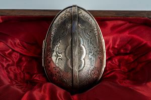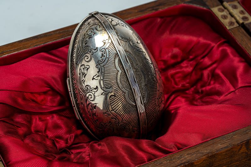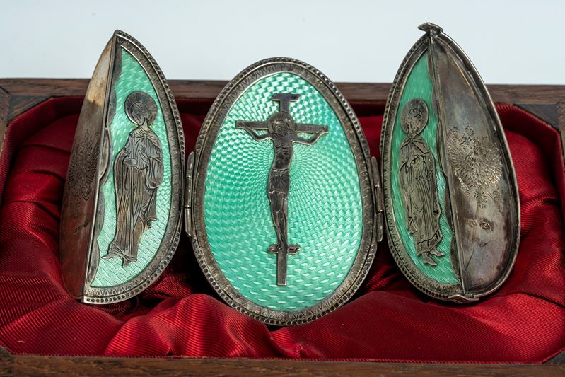Uovo tripartito in argento e smalti guilloché, cesellato al niello con volute vegetali e aquila imperiale bicipite. Mosca, fine XIX – inizio XX secolo
