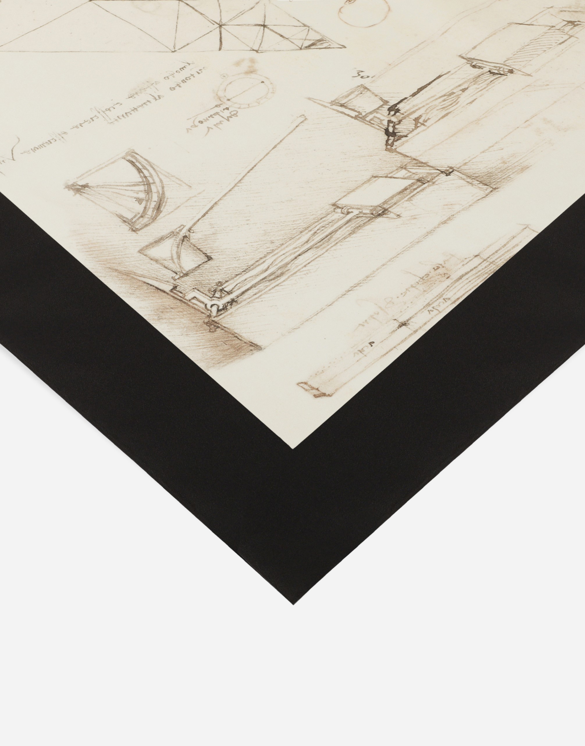 Foulard in silk twill printed with Leonardo Da Vinci’s drawings, refined with hand-rolled edge.