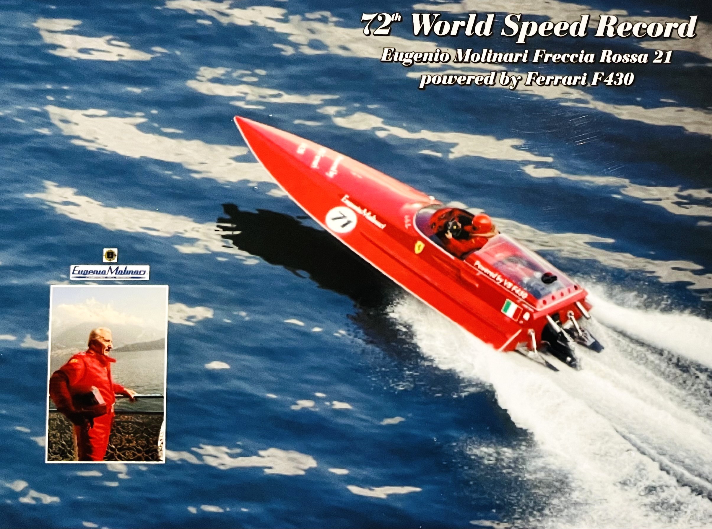 Un pezzo di storia nautica: questo esemplare unico nasce come prototipo di sviluppo per la leggendaria 'Freccia Rossa' — la barca motorizzata Ferrari F430 che il 16 giugno 2007 conquistò due record mondiali di velocità con Eugenio Molinari. Curata maniacalmente con tagliandi annuali e manutenzione totale, offre sull'acqua le stesse emozioni e la stessa agilità di una spider stradale di Maranello.