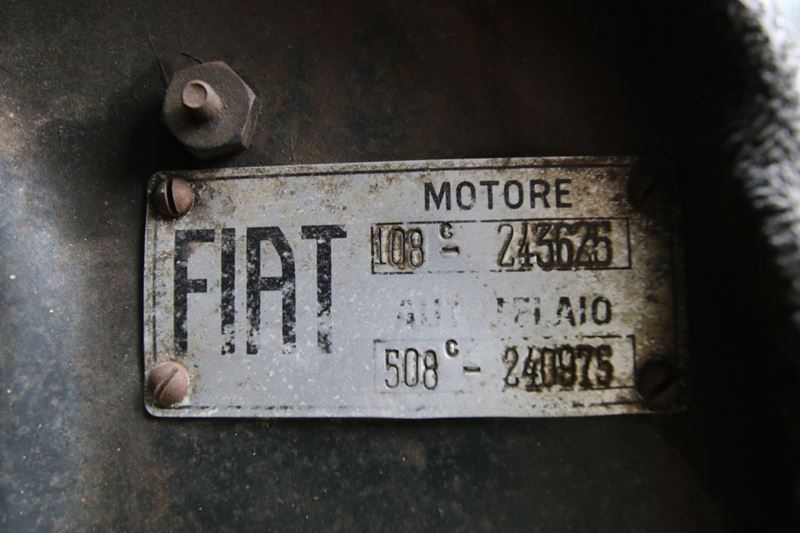 La Fiat 508 C, telaio no.508C240975,ha vissuto tutta la sua storia a Genova e territorio, per questo ha l’eccezionale particolarità per un’auto anteguerra, di avere ancora le targhe d’origine (in ferro) GE28402. Il libretto di circolazione d’epoca, “a pagine”, è più recente ma risale comunque agli anni’60. La vettura è conservata e completa, con le luci e frecce a bacchetta originali e luci e frecce aggiornate a codice.La meccanica è completa, ma da rivedere completamente;l a vettura non è marciante.Di colore verde scuro-nero, cerchi nero-crema con le coppe ruota originali e interni in panno beige conservati, completi ma con usura, con sovraccoperte d’epoca in finta pelle. Con l’auto: il libretto di uso e manutenzione, le chiavi originali, un set di valigie d’epoca. Un’ottima base per avere un’auto con lavori di ripristino ragionevoli o per raggiungere lo stato dell’arte.È un’ottima occasione per acquistare una vettura anteguerra ed entrare nel mondo delle più importanti gare di regolarità. La 508 C 1100 è eleggibile Mille Miglia dove gode di un coefficiente medio (1,50), anche superiore in altre competizioni. In quanto anteguerra, ha il vantaggio di posizionarsi presto nell’ordine di partenza.Il tipo di vettura, inoltre ha un equilibrio comfort-prestazioni-affidabilità-costi di gestione perfetto per le gare di regolarità di lunga durata.