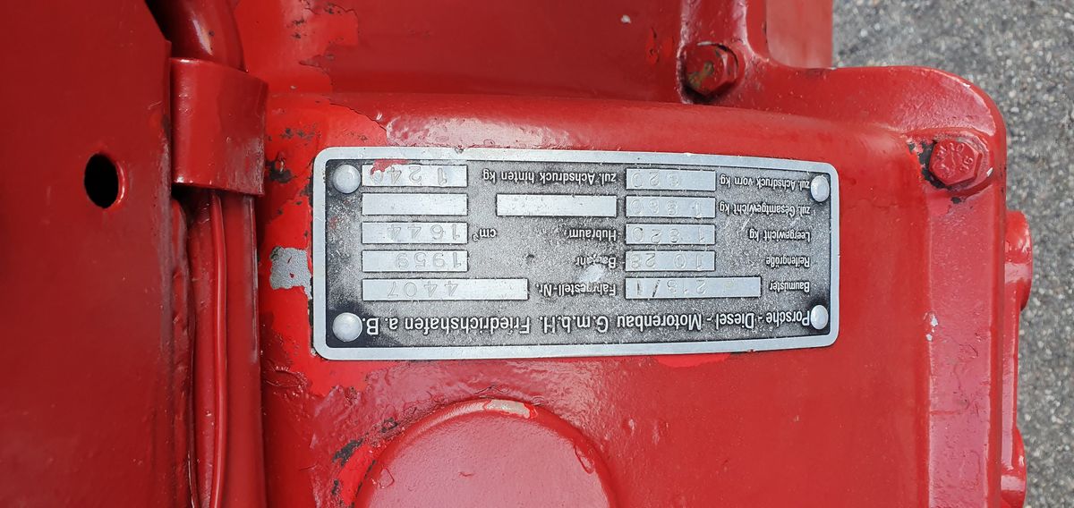 IltrattorePorsche-Diesel Standard218, telaio no. 4407 è un esemplare del 1959.Proviene dalla CollezioneSaottini.È stato restaurato e ridipinto nel suo corretto colore rosso con ruote giallo primula.Il mezzo è stato immatricolato nuovo in provincia di Padova ed è stato re-immatricolato nel 1994, sempre in Italia, con le attuali targhe Vicenza.È dotato di luci e dei dispositivi atti alla circolazione su strada.Il trattore è stato restaurato e si presenta “in patina”, conservato.La parte meccanicasi presentaanch'essa in buone condizionidi manutenzione, la frizione è da rivedere.Da segnalare che, di recente e sempre più frequentemente, i Porsche Club internazionali hanno accolto i trattori Porsche-Diesel nei loro meeting, coinvolgendoli nelle loro attività ed esposizioni.