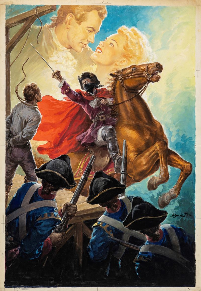 Bozzetto originale realizzato da Ballester per la locandina ufficiale del film "Il ribelle dalla maschera nera", diretto da Lesley Selander nel 1951. Fori di affissione al margine superiore e lievi pieghe agli angoli. Firmato.