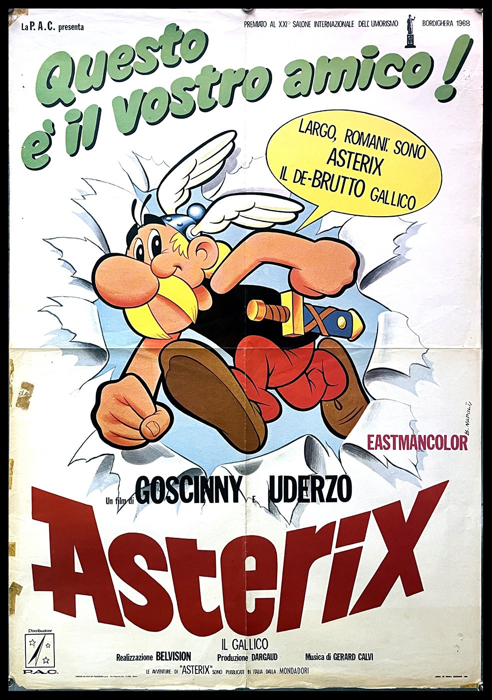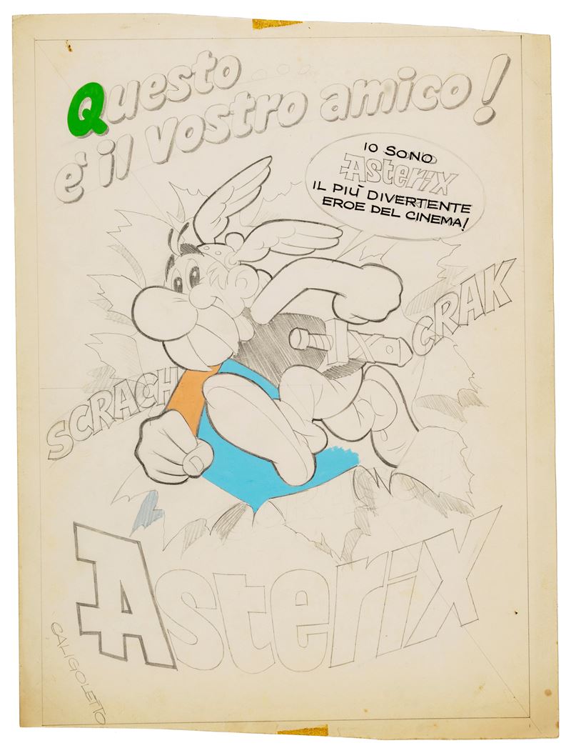 Bozzetto preliminare realizzato da Napoli per la locandina ufficiale del film "Asterix il gallico", diretto da Ray Goossens e prodotto Dargaud e Belvision nel 1967. Lievi pieghe ai margini e piccolo strappo al margine inferiore.