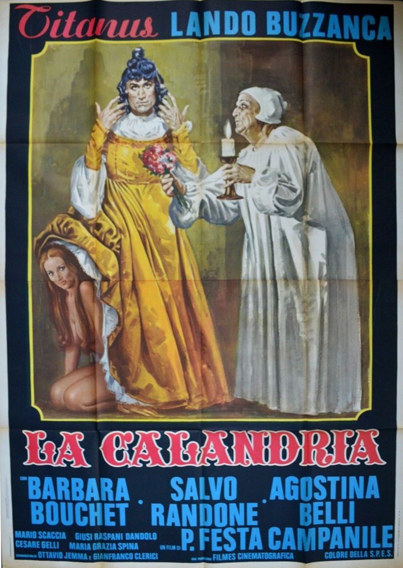 Bozzetto originale realizzato da Maro per la locandina ufficiale del film "La calandria", diretto da Pasquale Festa Campanile con Lando Buzzanca e Barbara Bouchet nel 1972. Fori di affissione agli angoli.