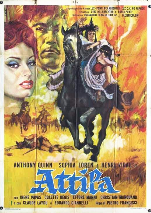 Bozzetto originale realizzato da Iaia per la locandina ufficiale del film "Attila" diretto da Pietro Francisci con Anthony Quinn e Sophia Loren nel 1954. Pieghe e strappi ai margini. Firmato.