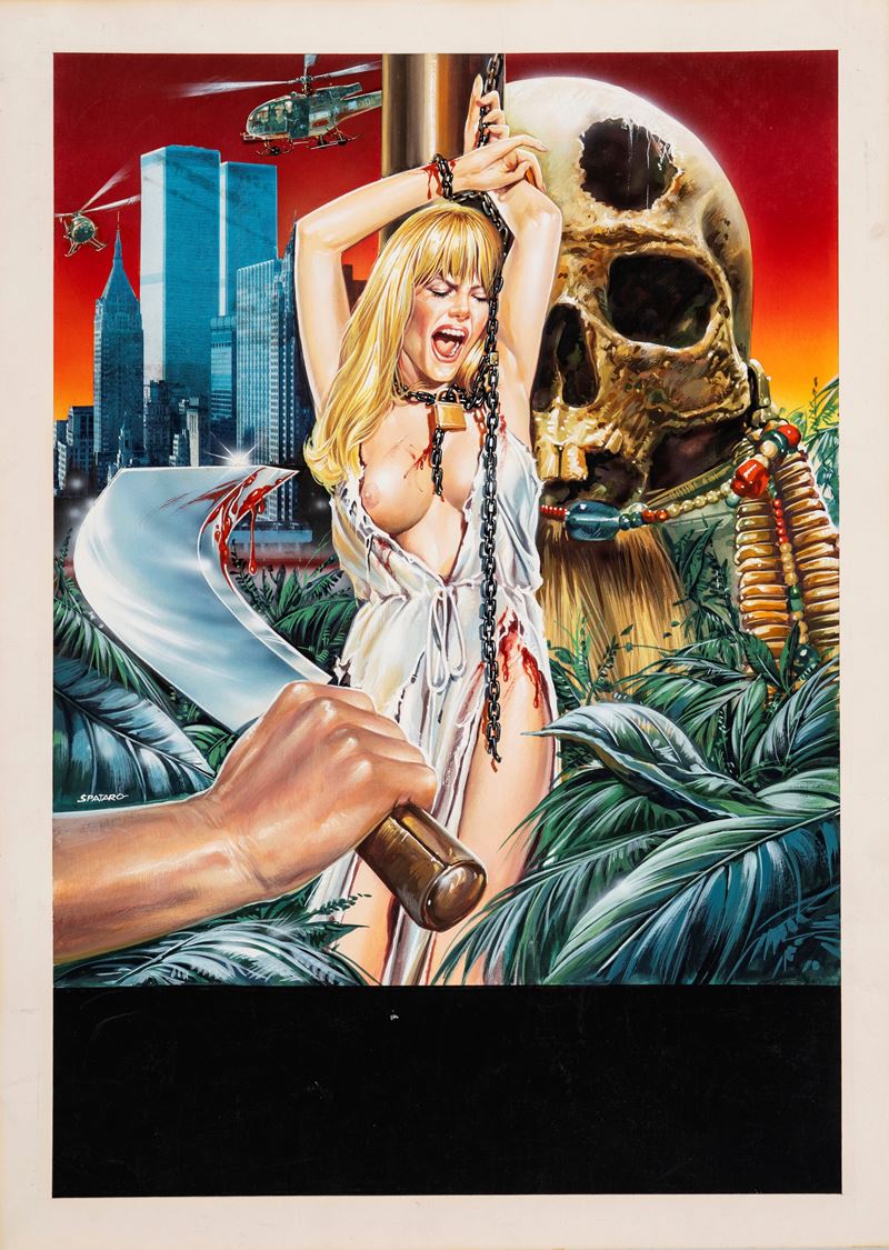 Bozzetto originale realizzato da Spataro per la locandina ufficiale del film "Devil Hunter" uno dei celebri Cannibal movie diretto da Jesús Franco nel 1980. Firmato.