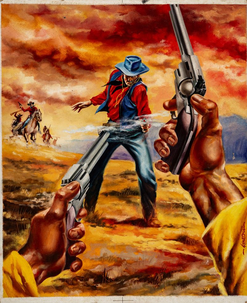 Bozzetto originale realizzato da Symeoni per la locandina ufficiale del film "Billy il mancino" diretto da Ray Taylor nel 1949. Ammaccature agli angoli. Firmato.