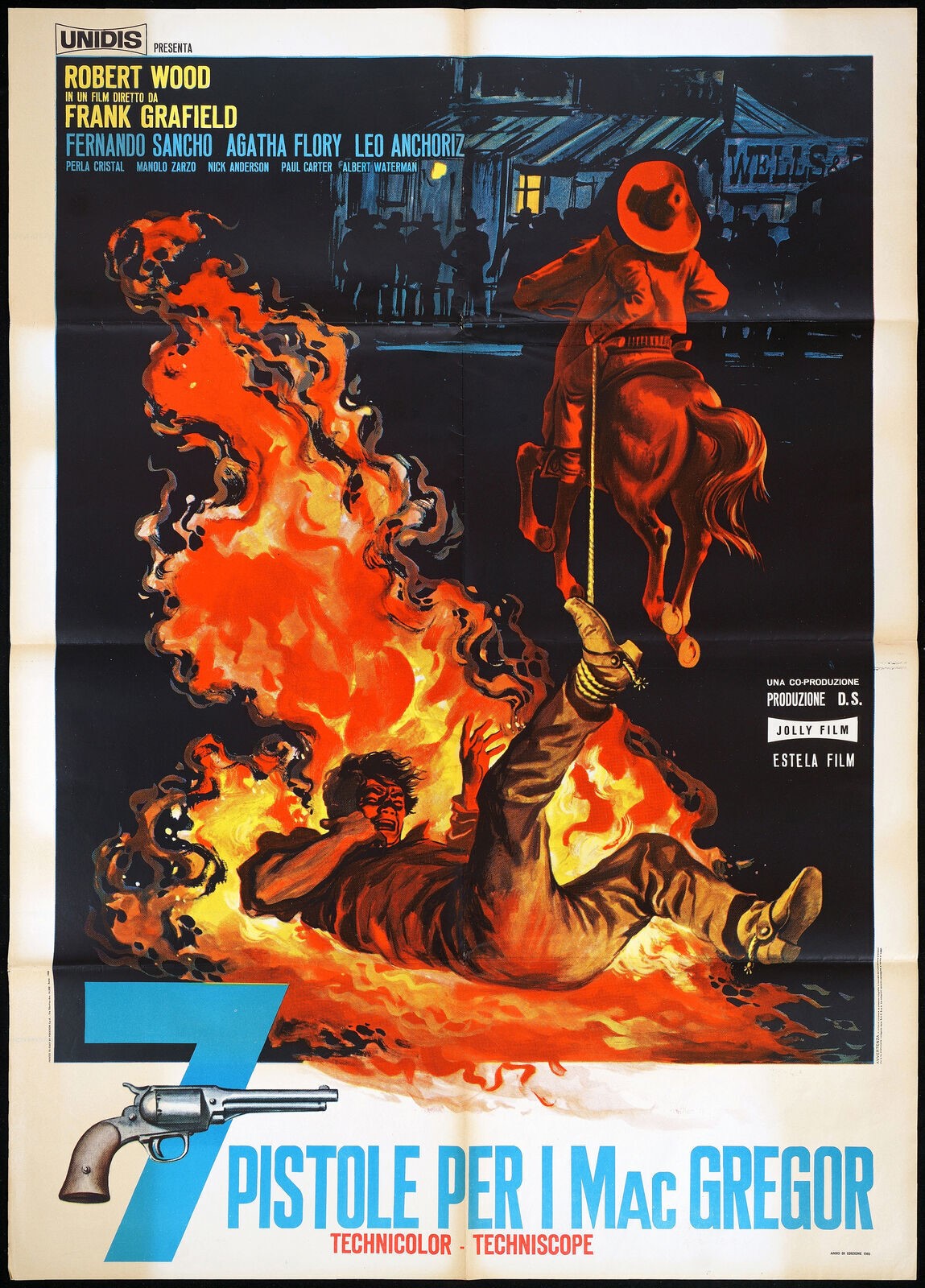 Bozzetto originale realizzato da Papuzza per la locandina ufficiale del film "7 pistole per i MacGregor", diretto da Franco Giraldi con Robert Woods e Agata Flori nel 1966. Alcuni fori. Firmato.