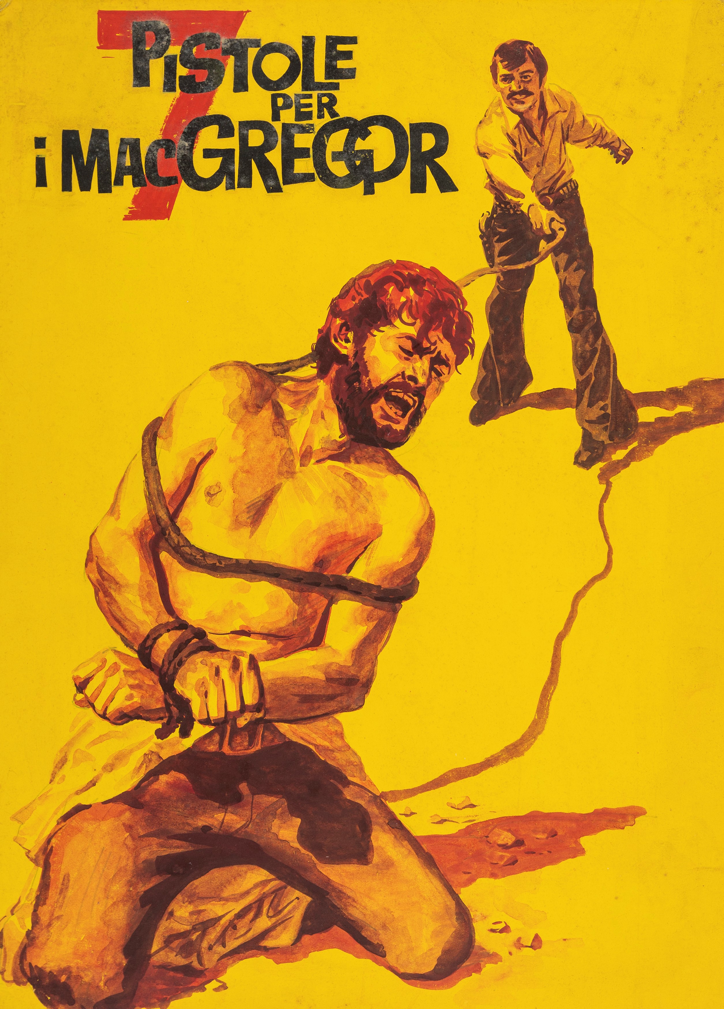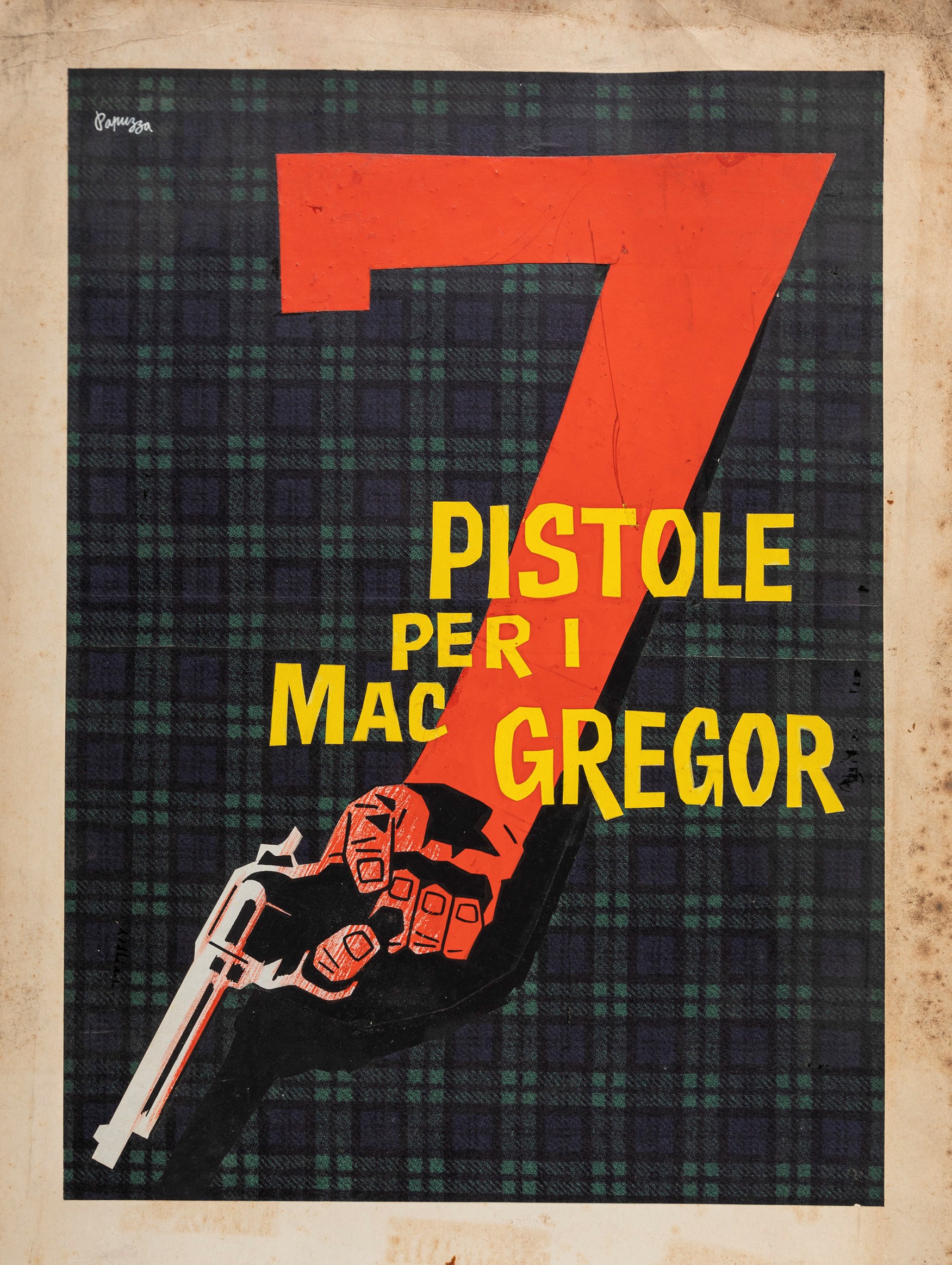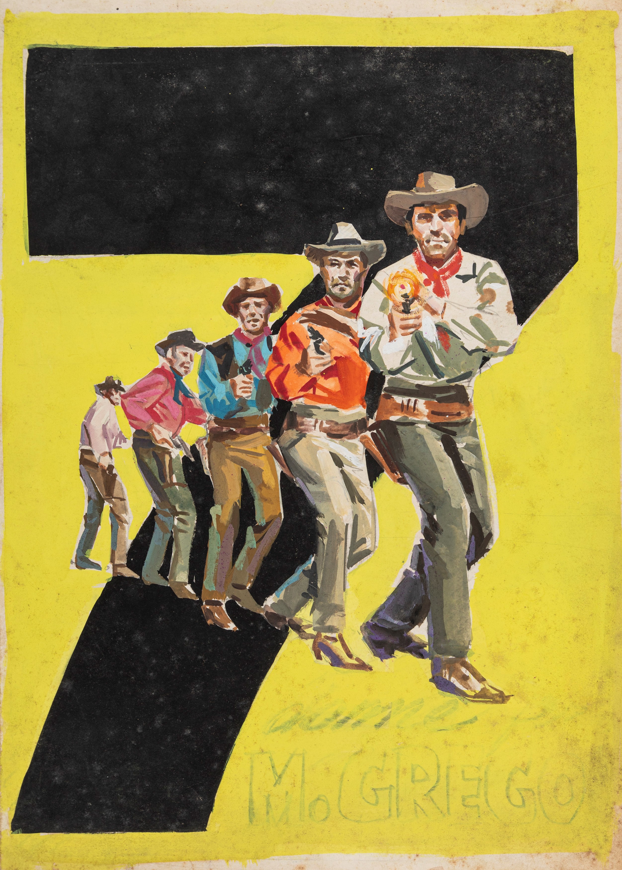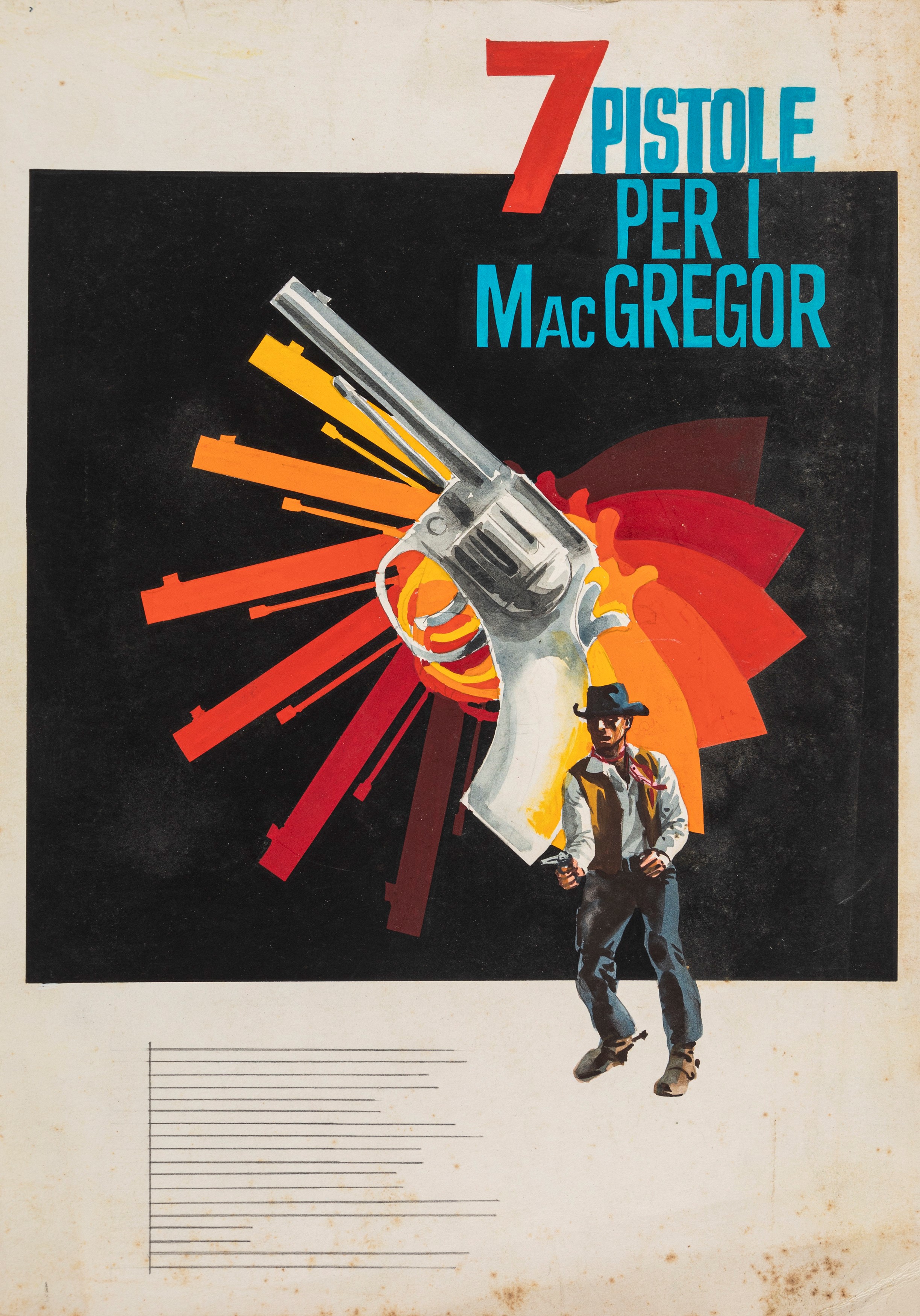 Lotto di 7 bozzetti preliminari realizzati da Papuzza per la locandina del film "7 pistole per i MacGregor", diretto da Franco Giraldi con Robert Woods e Agata Flori nel 1966. Lievi pieghe. Uno firmato.