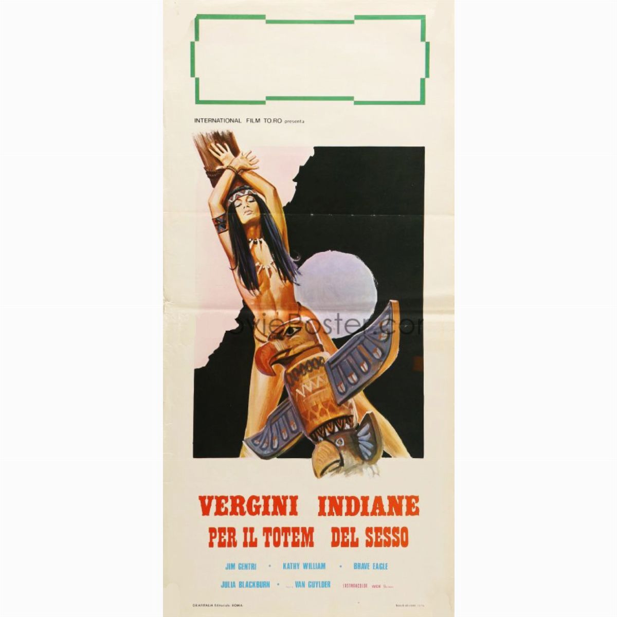 Bozzetto originale per la locandina ufficiale del film "Vergini indiane per il totem del sesso", diretto da Van Guilder con Julia Blakburn, Brave Eagle e Jim Gentry nel 1969. Estese tracce di umidità e piega all'angolo superiore destro.