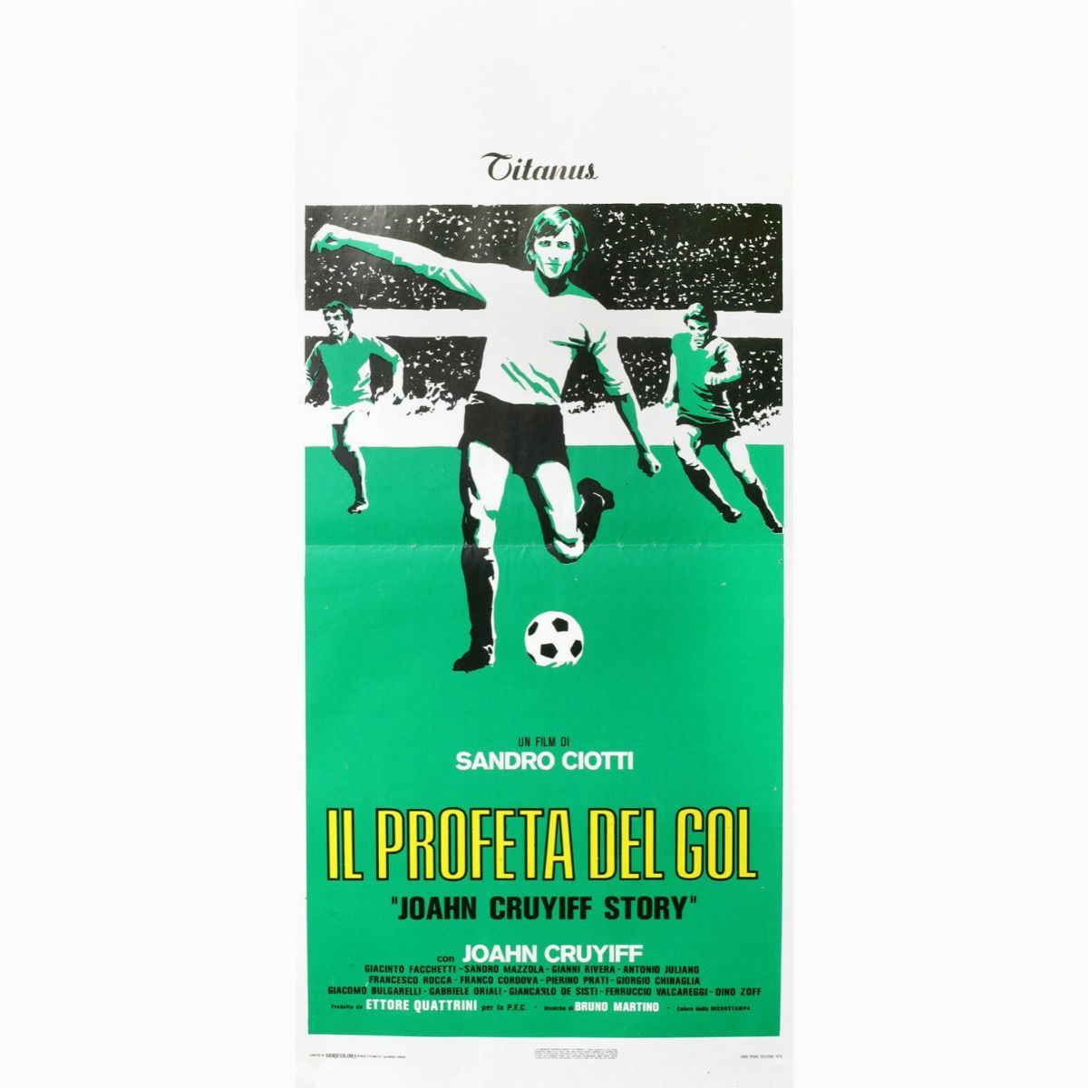 Bozzetto originale realizzato da Picchioni per la locandina ufficiale del documentario "Il profeta del gol", diretto da Sandro Ciotti con Johan Cruijff, Pelé, Gianni Rivera, Sandro Mazzola e Giorgio Chinaglia nel 1976.