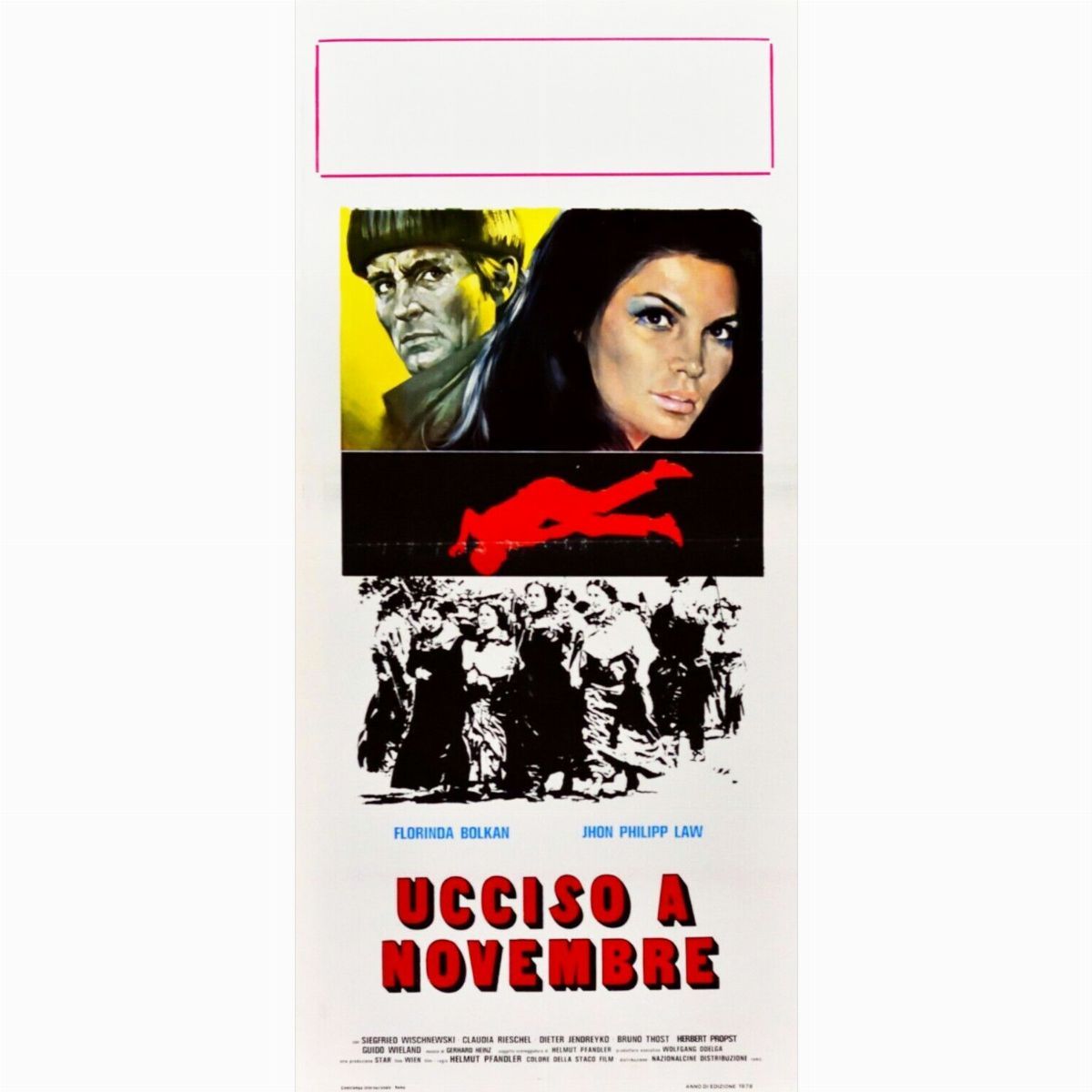 Bozzetto originale realizzato da Picchioni per la locandina ufficiale del film "Ucciso a novembre", diretto da Helmut Pfandler con John Phillip Law, Florinda Bolkan e Siegfried Wischnewski nel 1979.