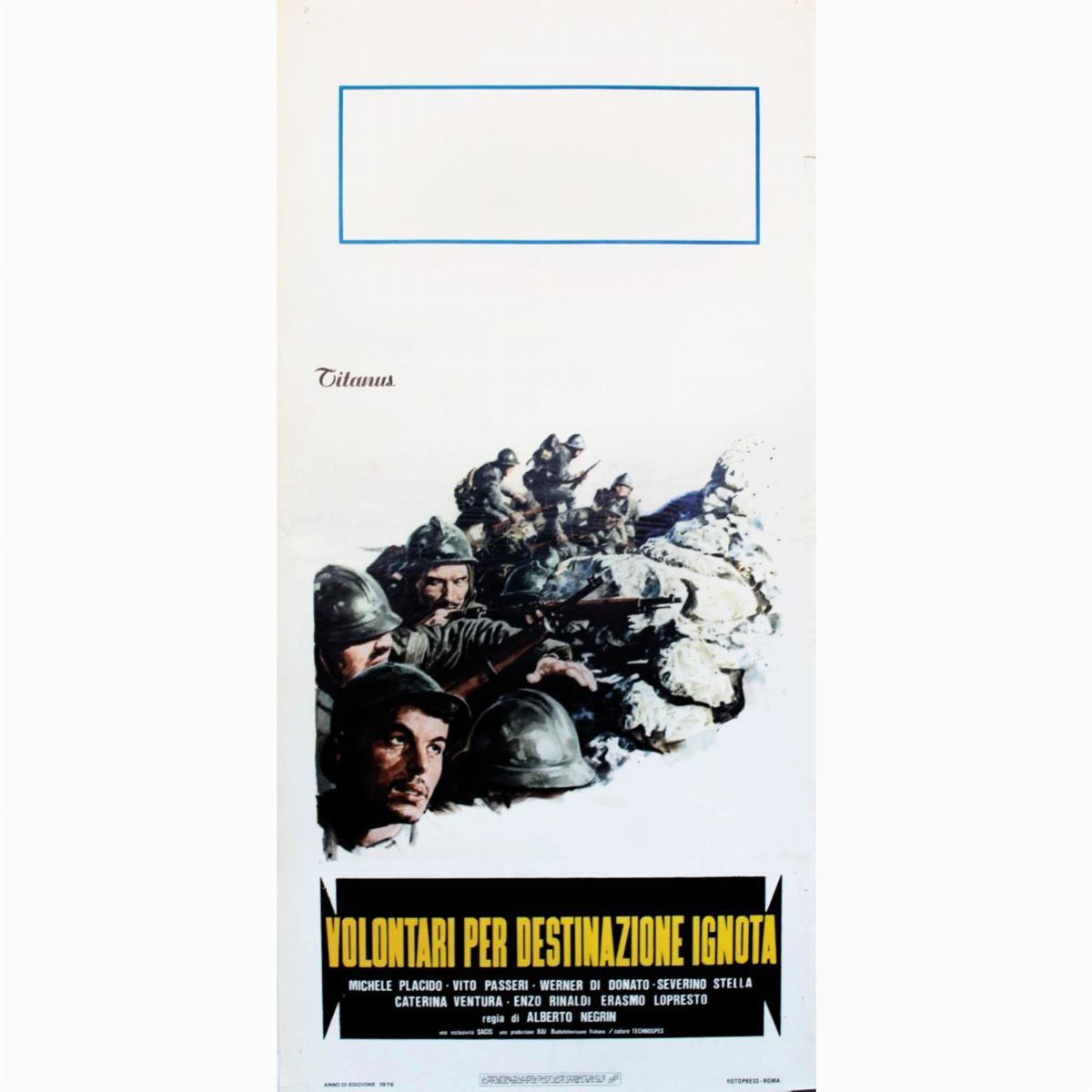 Bozzetto originale realizzato da Maro per la locandina ufficiale del film "Volontari per destinazione ignota", diretto da Alberto Negrin con Michele Placido, Pietro De Vico e Caterina Ventura nel 1978.