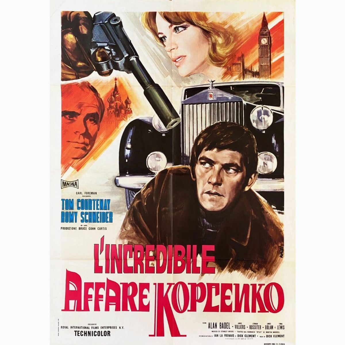 Bozzetto originale realizzato da Avelli per la locandina ufficiale del film "L'incredibile affare Kopcenko", diretto da Dick Clement con Tom Courtenay, Romy Schneider e Freddie Jones nel 1968. Lieve piega all'angolo superiore sinistro. Firmato.