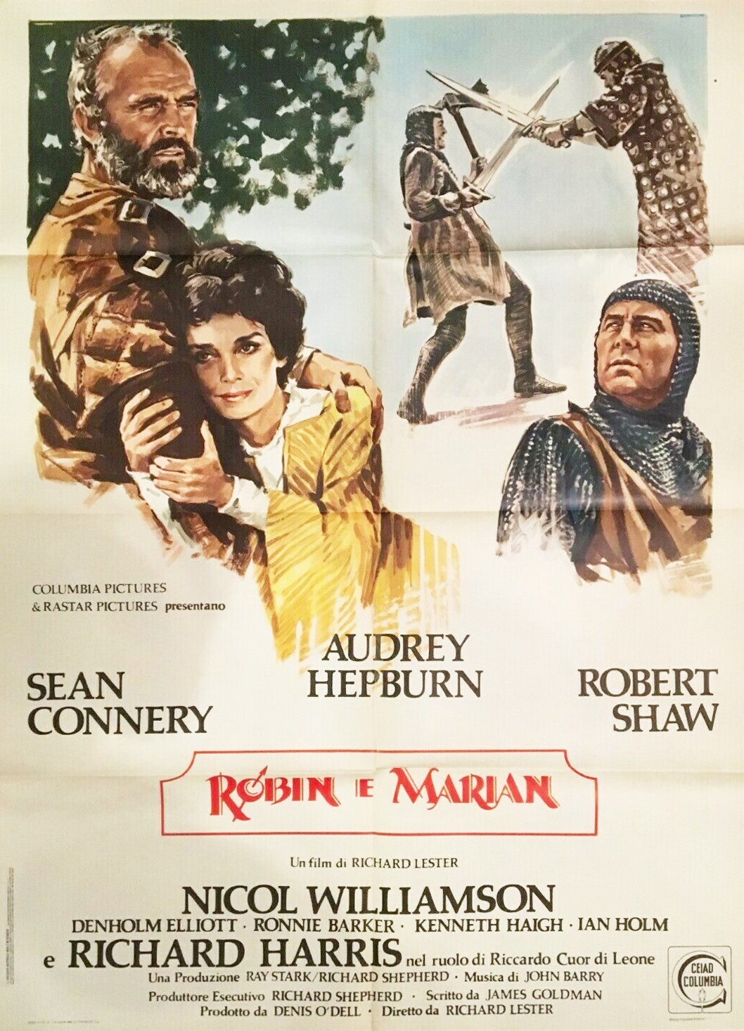 Bozzetto originale realizzato per la locandina ufficiale del film "Robin e Marian", diretto da Richard Lester con Sean Connery e Audrey Hepburn nel 1976. Fori di affissione ai margini e piccolo strappo al margine destro.