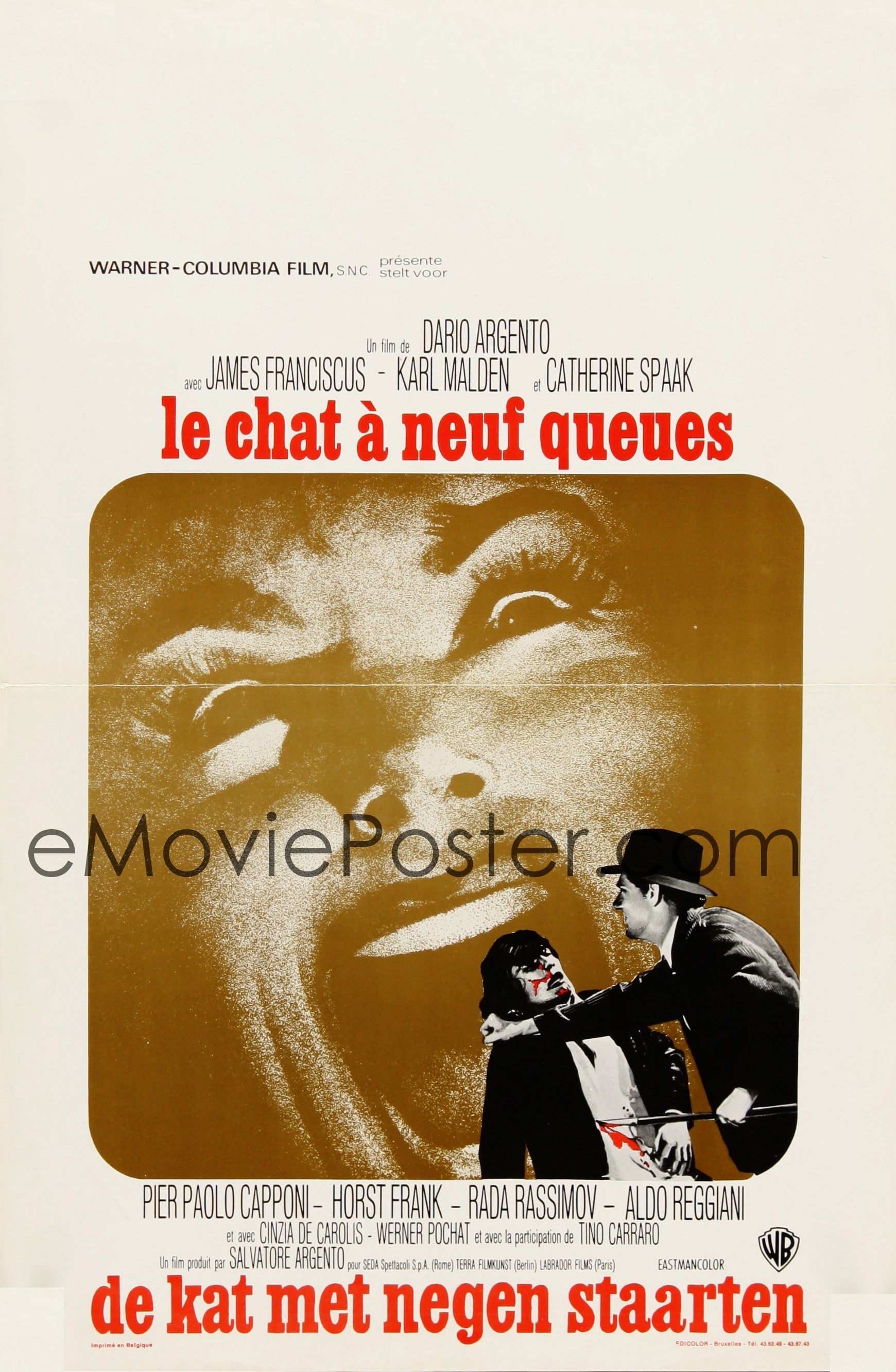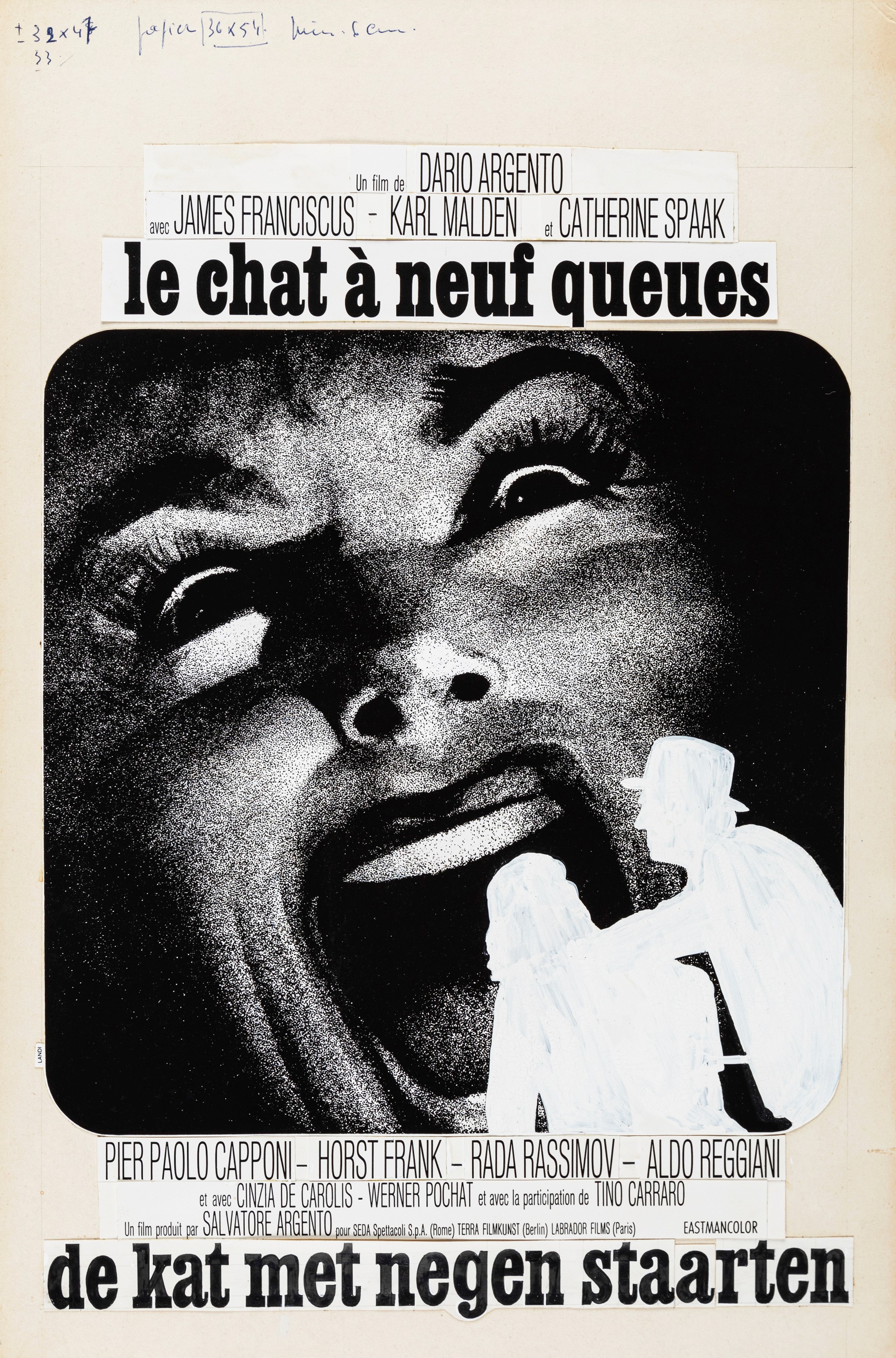 Bozzetto originale realizzato da Landi per la versione belga della locandina ufficiale del film "Il gatto a nove code", diretto da Dario Argento con Catherine Spaak, James Franciscus e Karl Malden nel 1971. Firmato.