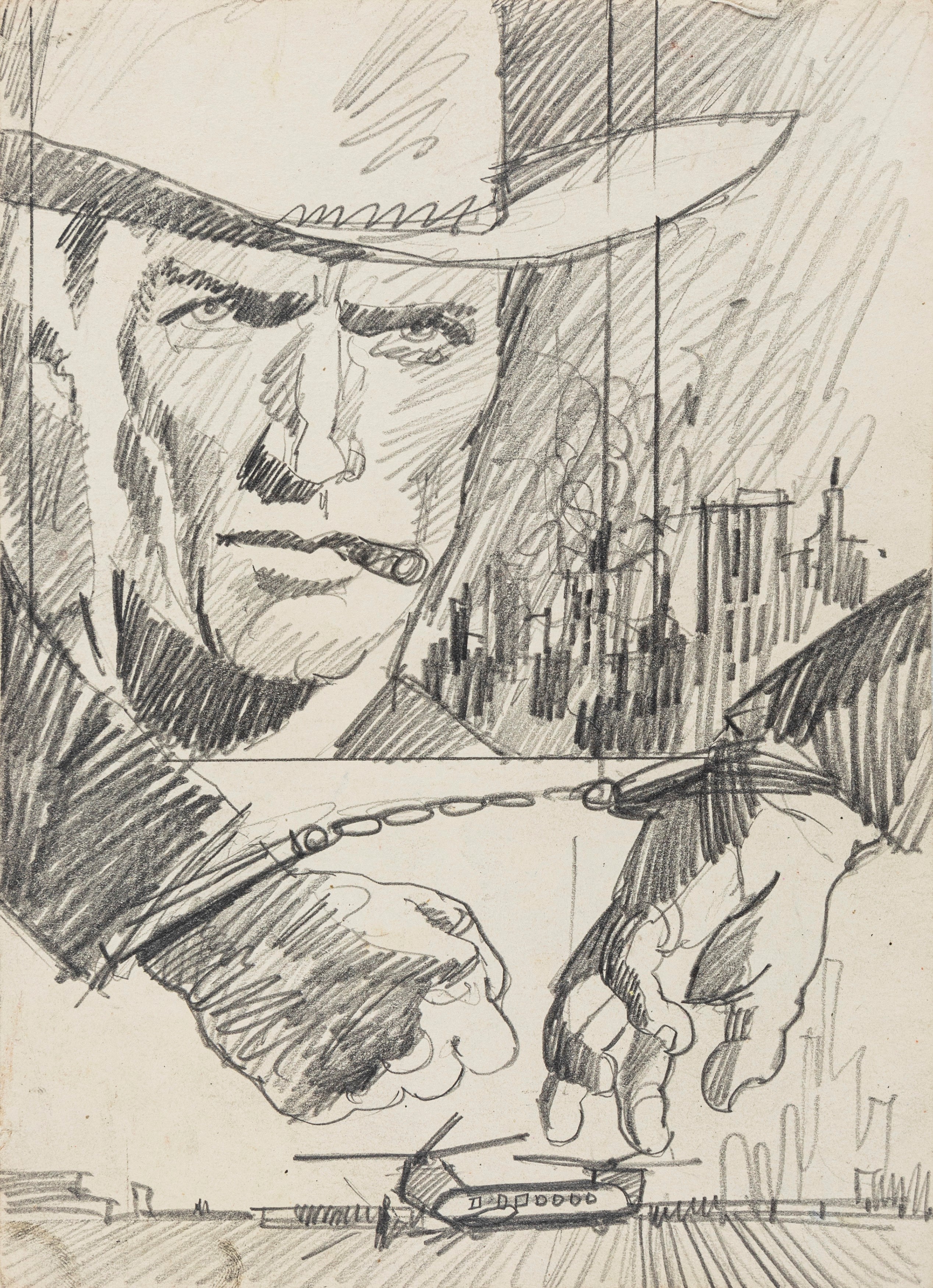 Lotto di 4 bozzetti preliminari realizzati dallo Studio Favalli per la locandina del film "L'uomo dalla cravatta di cuoio", diretto da Don Siegel con Clint Eastwood e Lee J. Cobb nel 1968. Piccola mancanza in un angolo.