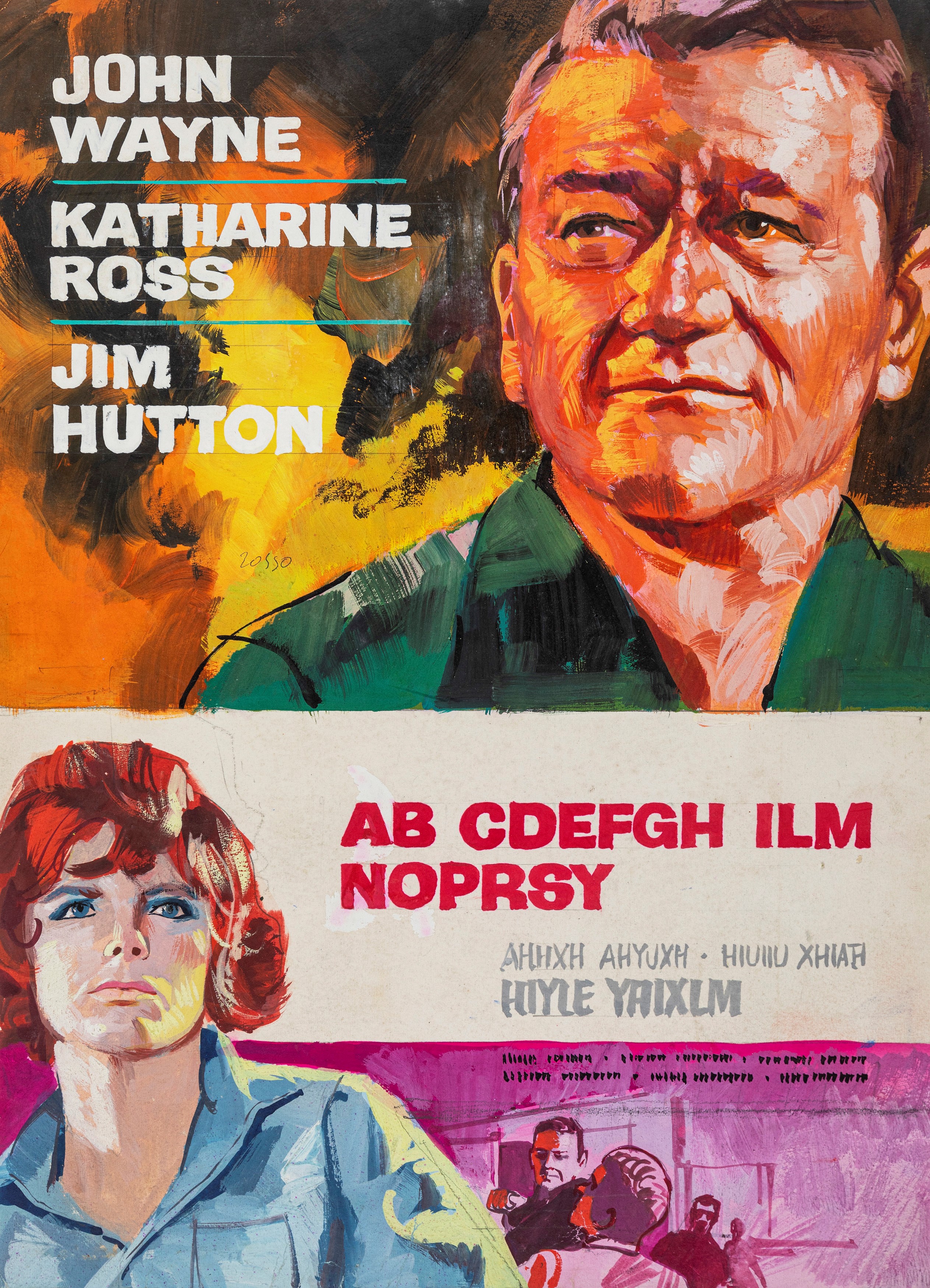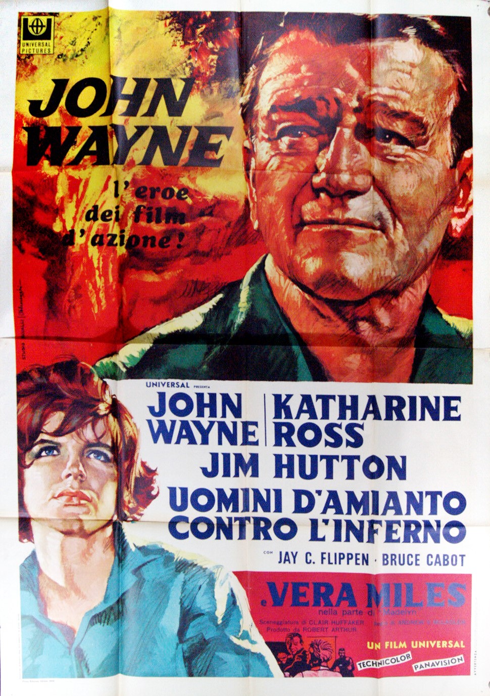 Coppia di 2 bozzetti preliminari realizzati dallo Studio Favalli per la locandina ufficiale del film "Uomini d'amianto contro l'inferno", diretto da Andrew V. McLaglen con John Wayne e Vera Miles nel 1968.