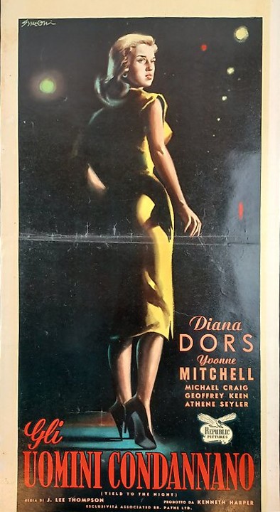 Bozzetto originale realizzato da Symeoni per la locandina ufficiale del film "Gli uomini condannano", diretto da J. Lee Thompson con Diana Dors e Michael Craig nel 1956. Fori di affissione agli angoli, piccoli strappi ai margini. Firmato.