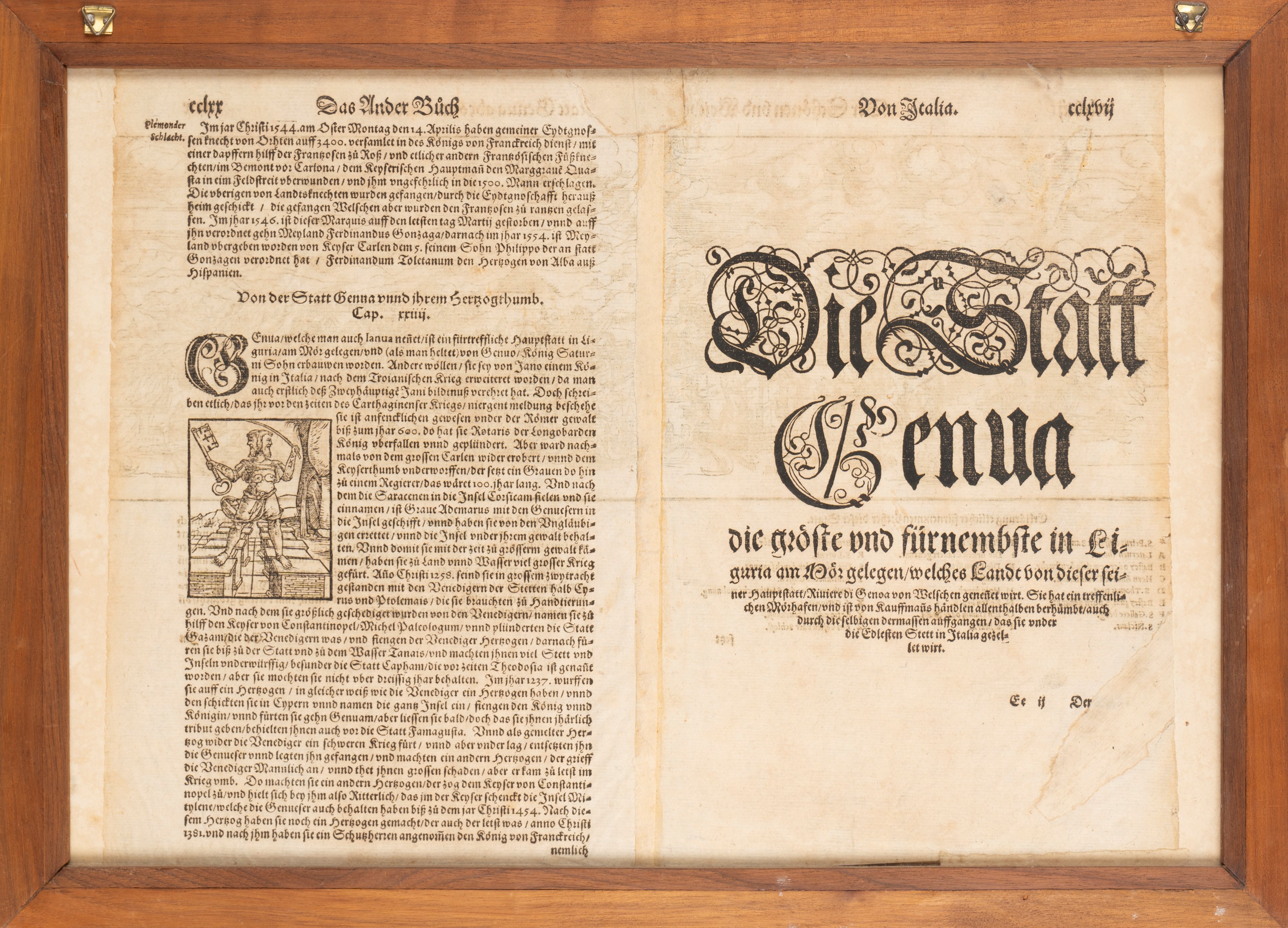 Xilografia di una delle prime vedute a volo d'uccello della città di Genova. Stampa tratta dalla Cosmographia Universalis di Sebastian Münster. Lievemente rifilata ai margini esterni.