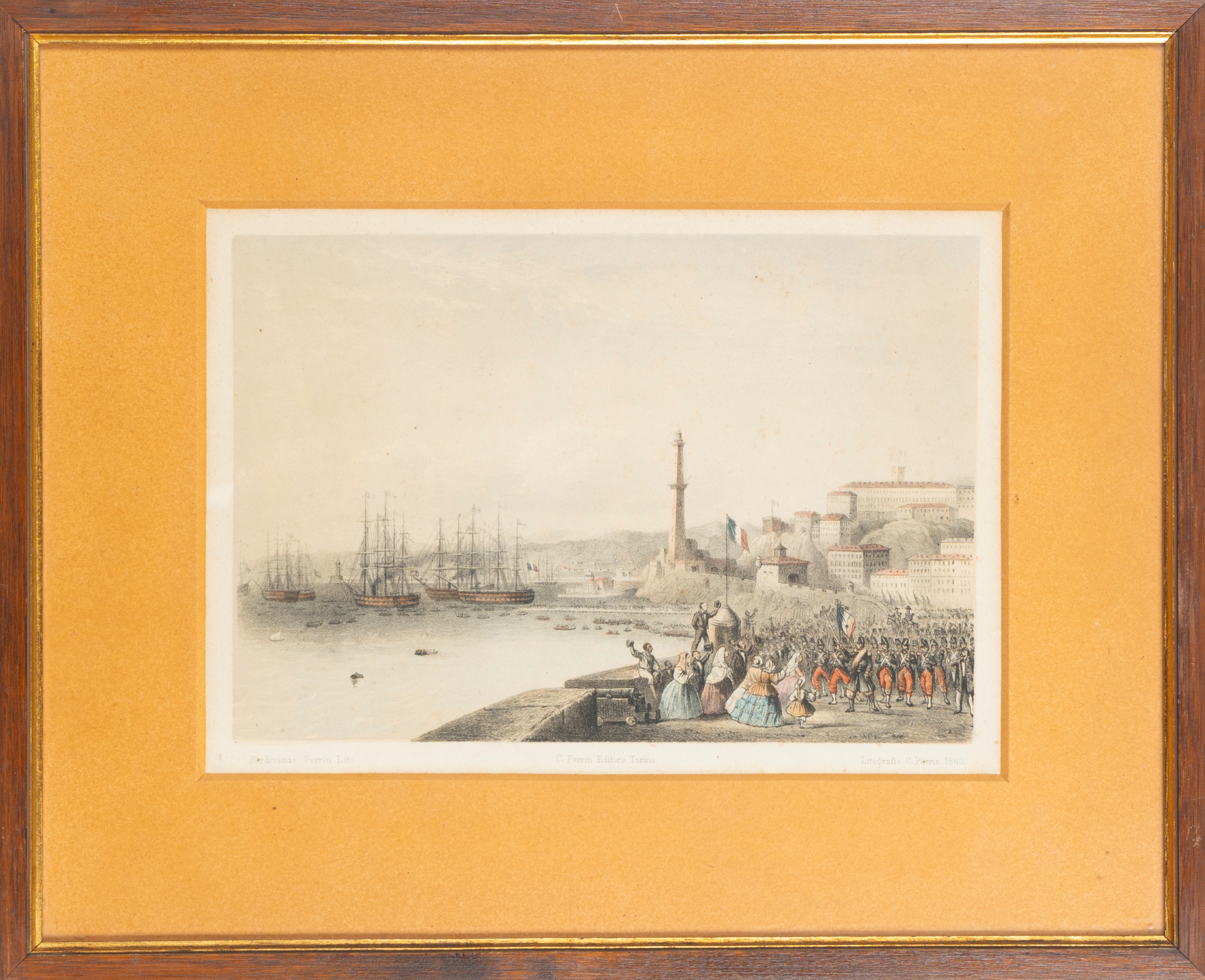 Coppia di stampe della seconda metà dell'Ottocento raffiguranti l'arrivo dei francesi a Genova, entrambe incise da C. Perrin a Torino.