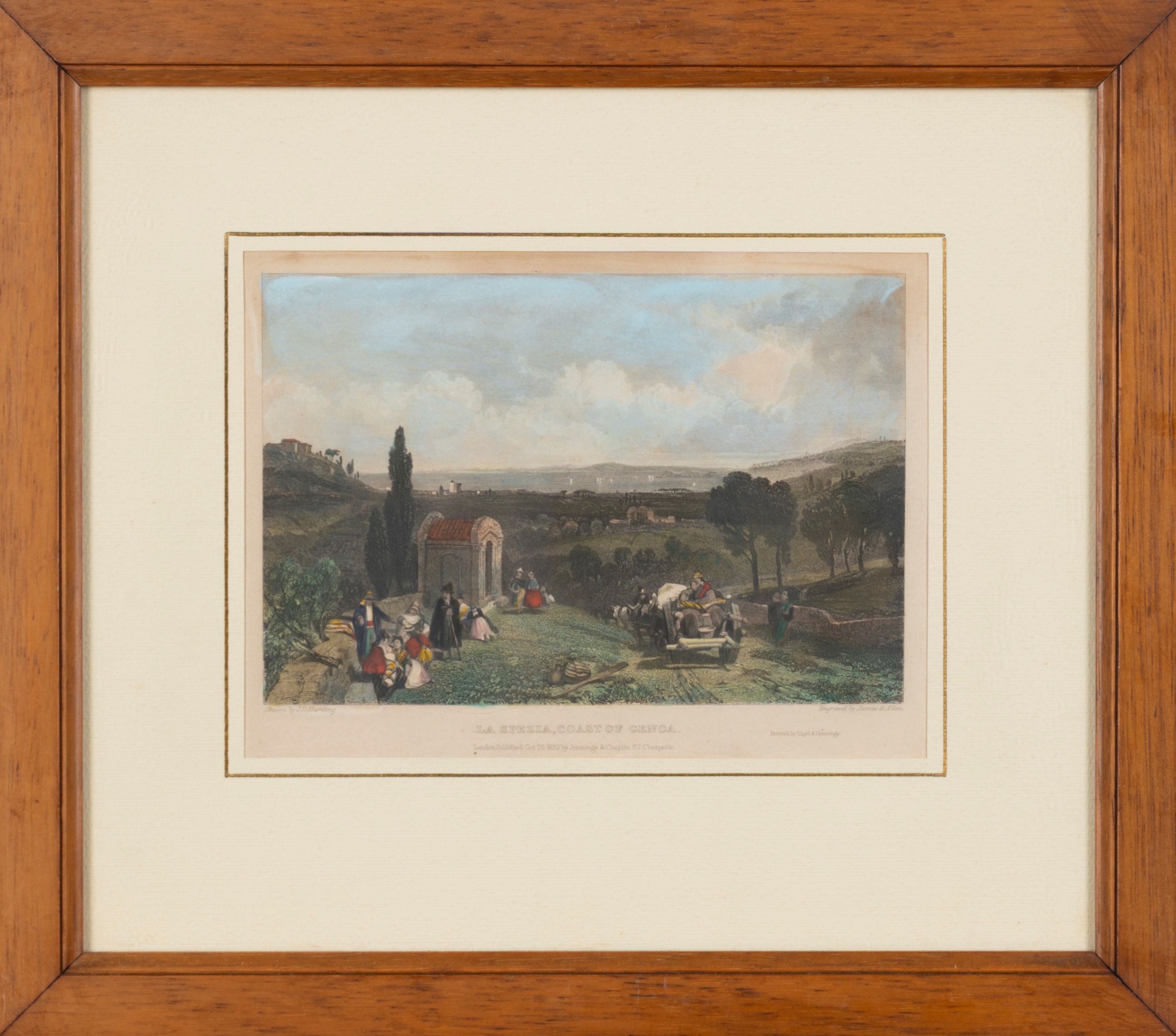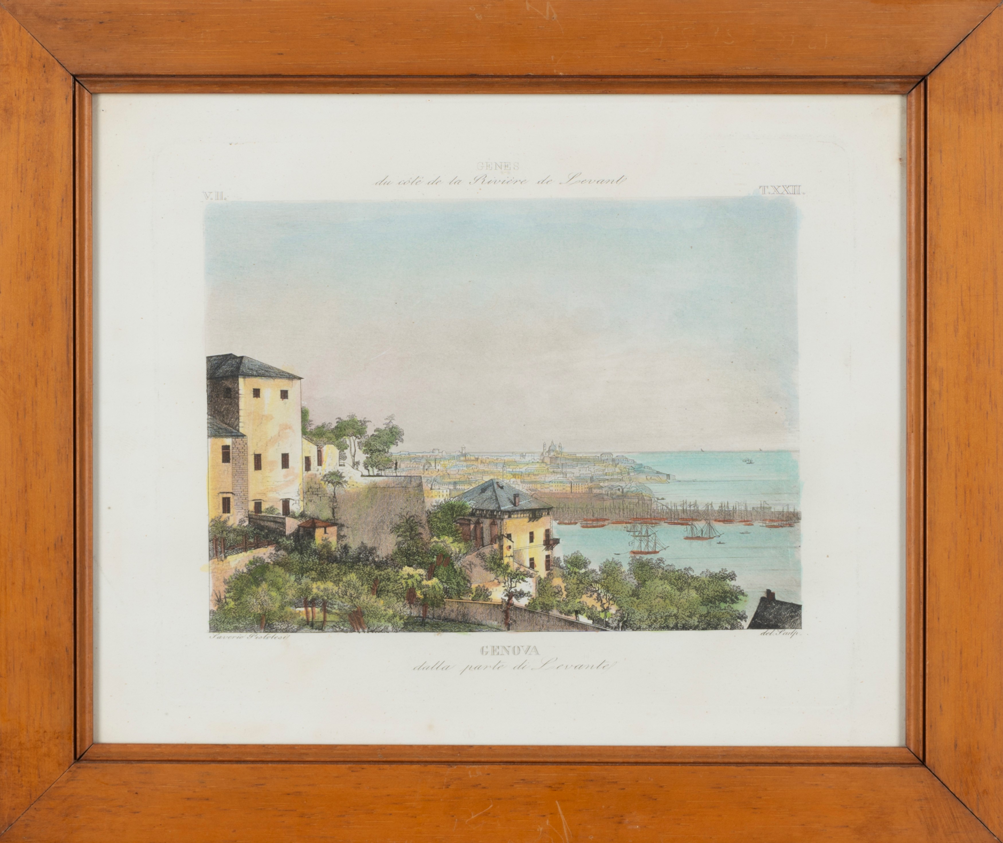 Deliziosa stampa acquarellata raffigurante Genova dalla parte di Levante è disegnata e incisa da Saverio Pistolesi; seguono nel lotto tre vedute di La Spezia, Noli e Savona.