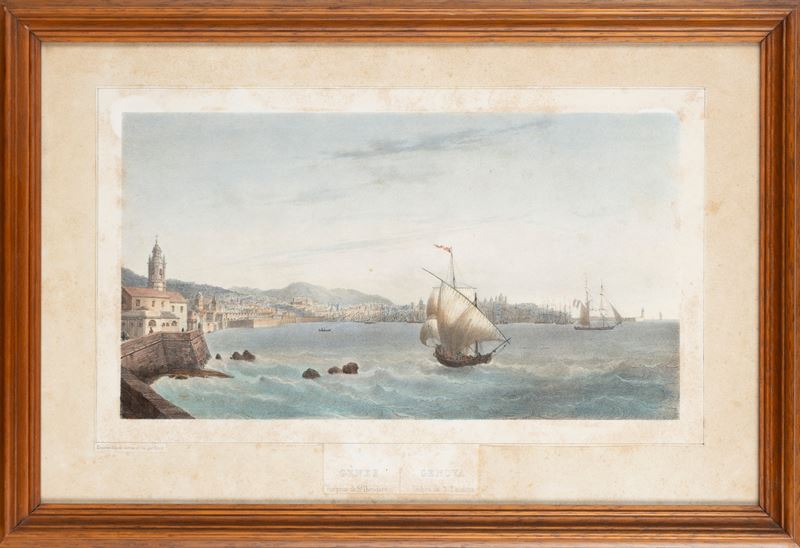 Litografia pubblicata da Lemercier, suggestiva veduta colta da ovest verso il porto, acquarellata coeva.