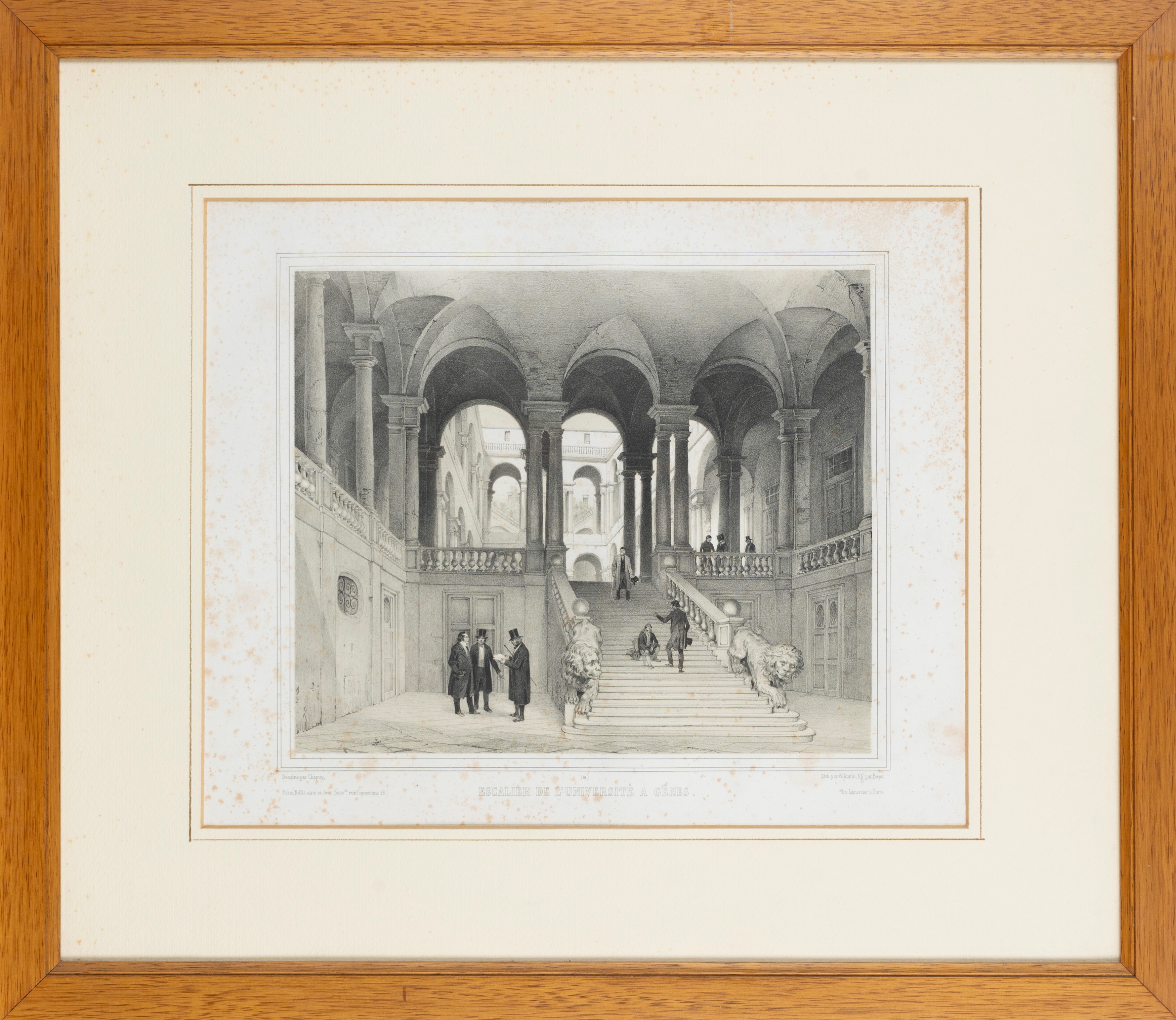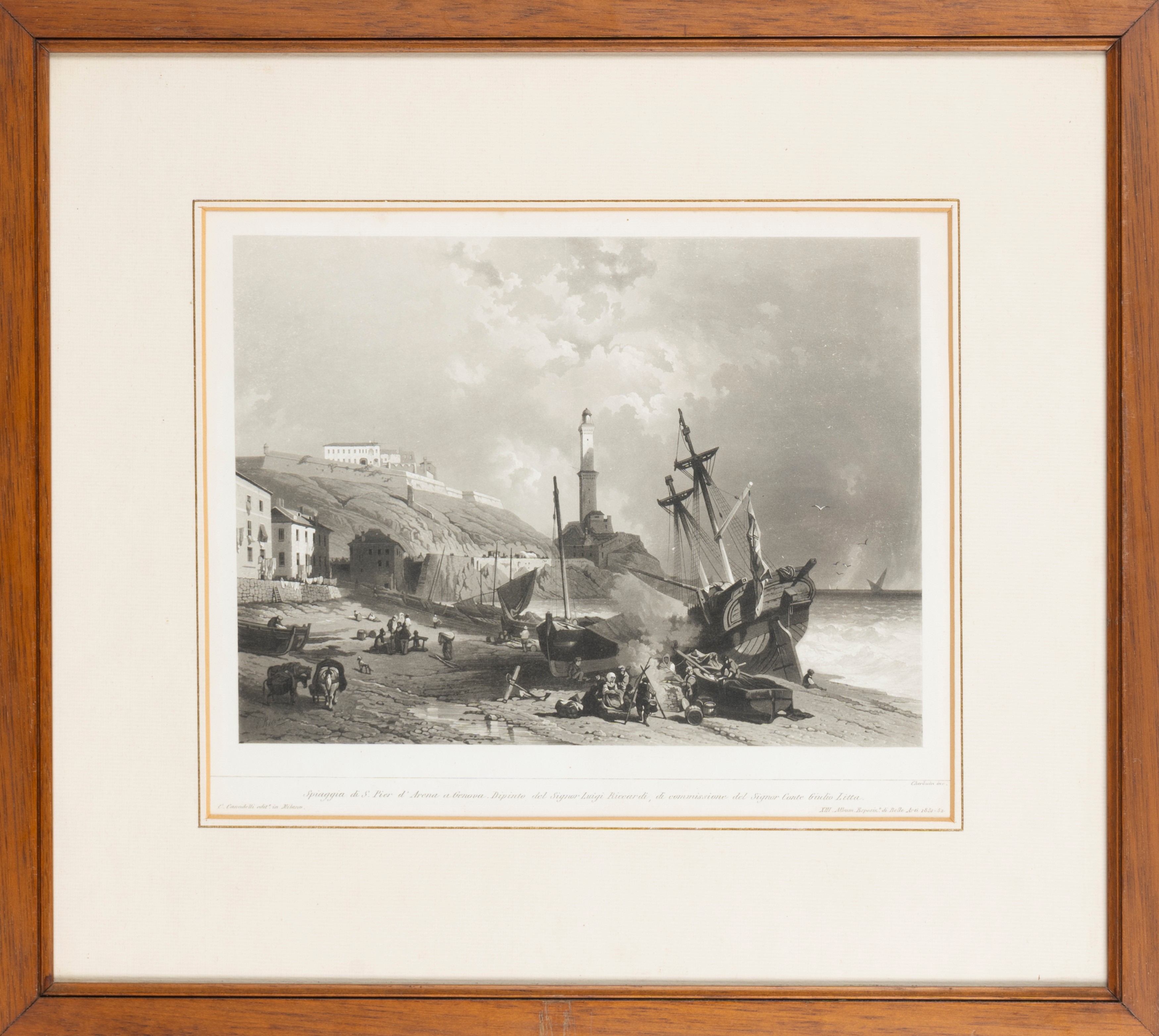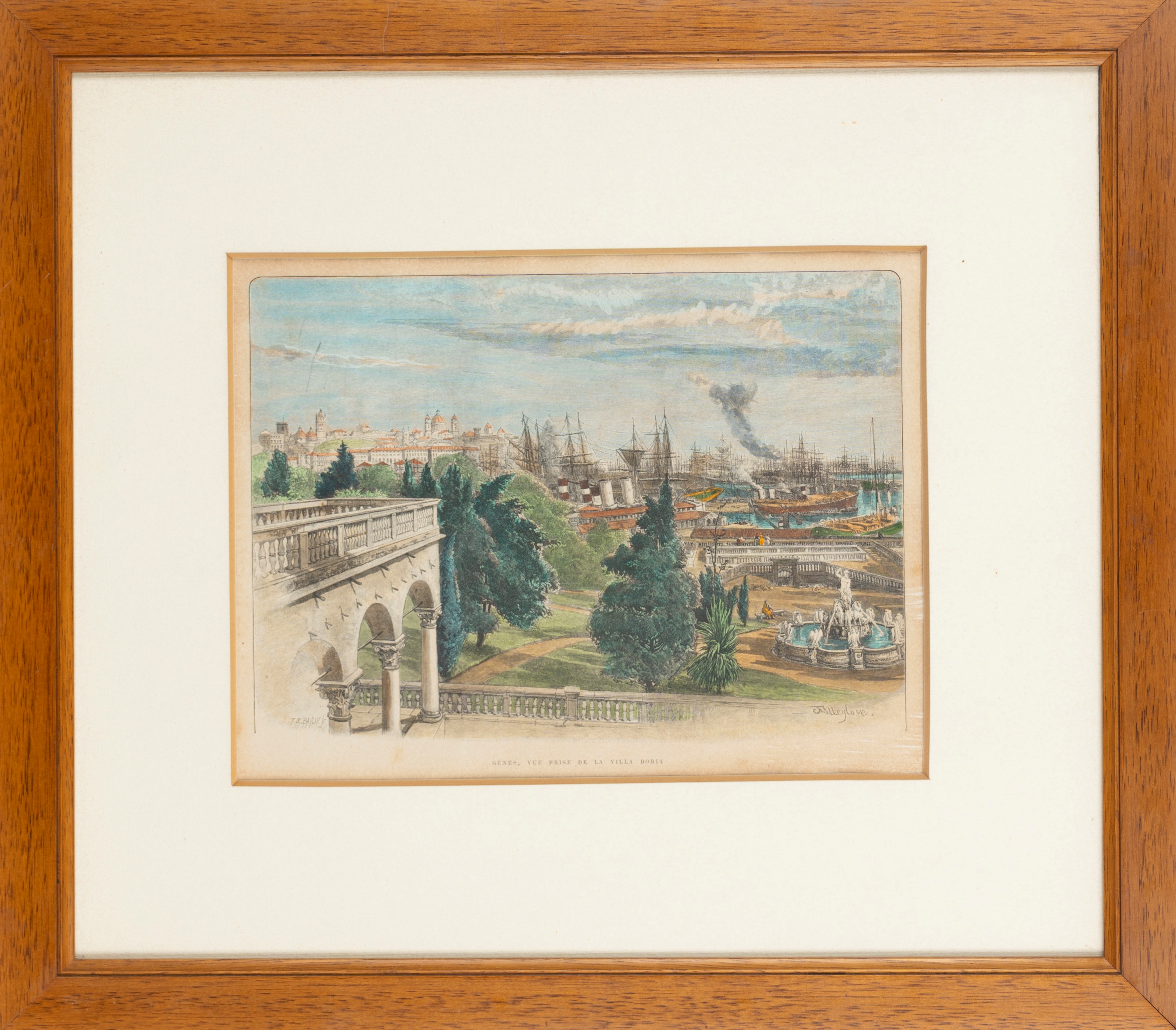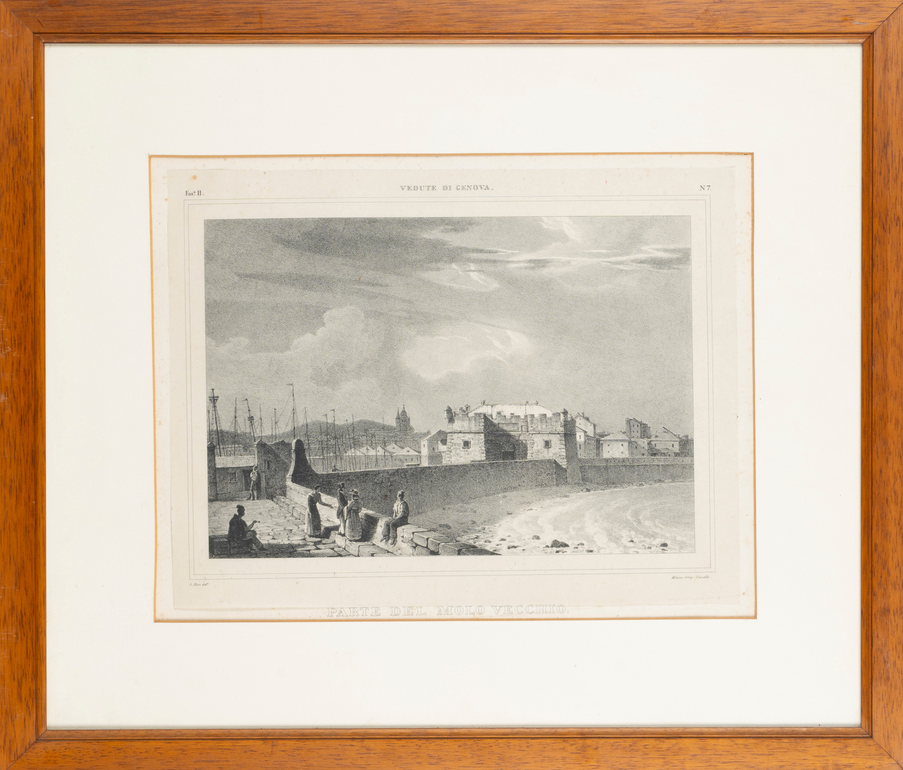Vedute di Genova - Parte del molo vecchio, stampa disegnata da G. Bisi e incisa da Vassalli; insieme nel lotto veduta di Genova presa da Villa Doria a colori, un'altra della spiaggia di S. Pier D'Arena e un interno dell'università di Genova.