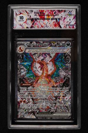 Una delle carte più desiderate ed iconiche del set Ossidiana Infuocata e del GCC Pokèmon, in lingua Italiana . L'artwork di Akira Egawa eleva Charizard a un nuovo standard estetico, esaltando la maestosità della forma Teracristal con un dettaglio grafico senza precedenti. La certificazione GRAAD 10 ne attesta la perfezione assoluta, rendendo questa carta non solo un pezzo centrale per ogni collezione di alto livello, ma anche un asset di grande rilievo nel panorama del collezionismo moderno. Un'opportunità rara di possedere l'icona più rappresentativa dell'era Scarlatto e Violetto nella sua condizione migliore possibile.