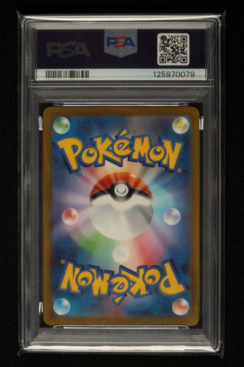 Carta promozionale giapponese dei Pokémon raffigurante Pikachu, certificata PSA 10. La carta fa parte di una collaborazione speciale con McDonald's del 2025. L'opera d'arte, realizzata dall'illustratore Yuu Nishida, ritrae Pikachu seduto a un tavolo di legno mentre osserva con entusiasmo un vassoio contenente un hamburger guarnito con una piccola bandierina a forma di Pokéball. La carta presenta un layout classico con il nome del Pokémon scritto in katakana nella parte superiore e un valore di 70 HP. Il corpo del testo descrive l'attacco "Spark", mentre in basso a sinistra è chiaramente visibile il numero di serie della promo, ovvero 020/M-P.